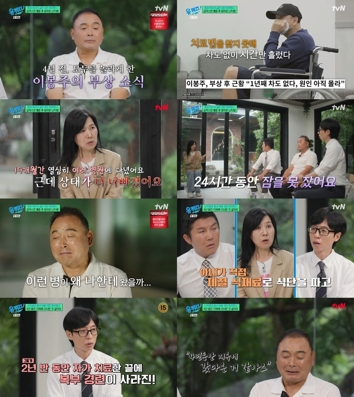 ‘유퀴즈온더블럭’.사진ItvN‘유퀴즈온더블럭’방송캡처전마라톤선수이봉주가난치병투병기를공개했다.23일방송된tvN‘유퀴즈온더블럭’에는국민마라토너이봉주가게스트로출연했다.이날유재석은난치병인근육긴장이상증을극복한이봉주에게“몸은이제괜찮아졌냐”고물었다.이봉주는“보다시피잘걸어다니고요즘은조금씩뛰기도한다”고답했다.이봉주는4년전방송촬영중돌연극심한통증을느꼈다며“모방송을촬영하다가갑자기배가내의지와상관없이뛰더라.처음부터그런건아니고조금씩안좋아지다가걷잡을수없이안좋아졌다.허리는계속굽어지고복부는경련수축이반복됐다”고회상했다.이후19개월동안유명한대학병원,한의원등을수도없이찾아갔지만효과는없었다고.이봉주의아내는“병원에서도원인을알수없어서약만처방해주고침만놔줬다.스포츠마사지도받아보고개인PT도받아봤다.나중에는점점목이조여가서먹는것도힘들어하고숨쉬는것도힘들어했다.24시간잠을못잤다.정말마음이아팠다”고토로했다.이봉주는“이런병이왜나한테왔을까싶었다.원인을모르니까,원인을찾을수없으니까더답답했다.한방치료부터침치료,한약치료,기치료까지받아봤는데다소용없었다”고말했다.이어“결국수술을결정했다.그런데아내는반대했다.수술을하면평생후회할거라고반대했다.그런데나는지푸라기라도잡고싶은심정이었다.결국수술을했는데더안좋아졌다.오히려목도더꺾여서‘ㄱ’상태가됐다.집에들어가니까아내가‘수술문제가아니다’라고했다.그때부터아내가하라는대로했다”고했다.이봉주의아내는음식을제대로먹지못하는이봉주를위해모든음식을다갈아먹이고직접마사지도해줬다고.그렇게2년반동안자가치료를한끝에복부경련이사라졌다고해모두를놀라게했다.이봉주는“4년동안지옥에갔다온것같다”고말했다.이어다시뛰기시작한때를떠올리며“아팠을때는30분이라도내몸으로뛰어보는게소원이었다.그만큼정말절박했다.그런데꿈이현실이됐다”고미소지었다.[이세빈스타투데이객원기자]Copyright©스타투데이.무단전재,재배포및AI학습이용금지
