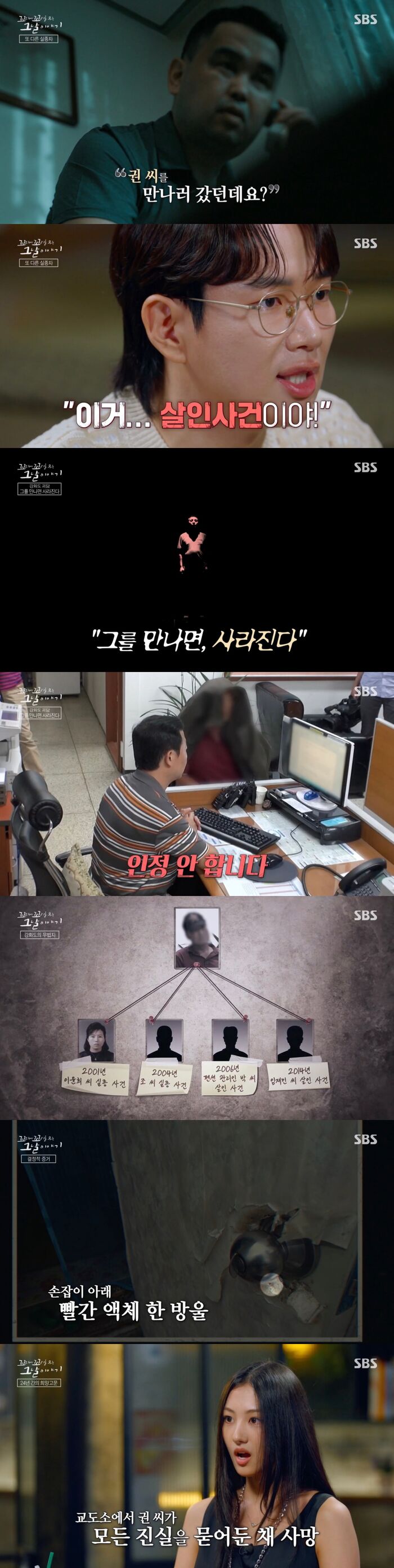 [SBS연예뉴스|김효정에디터]권씨만만나면사라지는사람들,강화도괴담의진실은?24일방송된SBS'꼬리에꼬리를무는그날이야기'(이하'꼬꼬무')에서는'강화도괴담-그를만나면사라진다'라는부제로강화도일대를공포에떨게만든괴담을추적했다.지난2001년집으로돌아간다던연주씨의어머니가사라졌다.일때문에가족과떨어져지내던이윤희씨는딸을만나기위해친정에다녀간후연락이두절된것.이에실종신고를했지만한달이지나도일년이지나도이씨는찾을수없었다.그리고13년이흐른2014년한건의실종신고.그런데형사들은실종된임씨가권씨를만나러간후사라졌다는이야기에이것은단순실종이아닌살인사건이라확신했다.앞서권씨를만난후사라진인물이셋이나더있었던것.그리고그첫번째는바로연주씨의어머니인이씨였던것이다.당시권씨가운영하던횟집에서일하던이씨는권씨와내연관계였다.그리고이씨는권씨와다툰후행적이묘현해졌던것.하지만당시수사에서권씨는허무맹랑한거짓말로자신과관련없는사건이라고했고수사에서도그는거짓말로일관했다.그러나이후권씨를용의자로특정할수있는증거는찾지못했고이에권씨는무혐의처분을받았다.그런데이후또한건의실종사건이발생했다.몇년뒤엔권씨가수족처럼부리던조씨도사라진것이다.앞서조씨는이씨의실종사건이후술만마시면"내가말하면그사람은징역형이다"라는말을입버릇처럼하기도했던것.그리고조씨는실종직전권씨와다퉜고이에자신과친분이있던형사에게"모든것을말하겠다"라는의미심장한이야기까지했던것으로밝혀져눈길을끌었다.조씨실종사건의유력한용의자로떠오른권씨.하지만그는"시신을찾아오면인정하겠다"라며당당한모습을보였고그어떤결정적증거를찾지못해이번에도무혐의처분을받았다.그런데또몇년후권씨는살인사건의용의자로떠오른다.권씨와땅문제로다툼이있었던펜션관리인박씨의시신이야산에서발견되었고,시신이발견된야산을내려오는모습이포착된권씨는유력한용의자로떠오른것.이에경찰은권씨를체포했고구속영장을신청했다.구치소에갇힌권씨는불안증세를보이며형사에게우발적범행인경우형량이어느정도되는지물었다.그리고고민해보겠다고했던것.하지만동기불충분으로구속영장이기각되자그는언제그랬냐는듯범행을부인하며결백을주장했다.그렇게다시한번풀려난권씨,그리고8년뒤또다시살인사건의용의자로떠오른것.권씨와엮이면죽는다는괴담이돌기시작한강화도.이에주민들은그와거리를두기시작했다.강화도에서땅부자로유명했던권씨.하지만그는땅을담보로돈을빌리고그돈으로땅을사고,다시그걸담보로돈을빌리고또땅을사는이른바땅돌려막기를했고이에빚더미에올랐다.그가은행에빌린돈은원금만약25억원에한달에이자800여만원을납부해야했던것.이에권씨는땅강매를했고많은이들과충돌이일어났던것.특히권시는친한친구와도땅때문에갈등을빚어친구를해하려고했다.절도,사기등전과33범이된권씨는경찰서를제집처럼드나들었고네건의강력사건유력용의자로떠오른것.권씨는실종된임씨와도땅문제로엮인사이였던것.이에경찰들은이번에는권씨를붙잡기위해비밀수사를시작했다.경찰들은임씨의시신이발견되자CCTV를통해권씨의행적을포착했다.이에임씨가권씨를만나러갈때탔던차량을몰고이동하는권씨가포착되었다.이후권씨의행적을추적하며임씨의유류품들도발견되었고그것에서권씨의지문이검출되었다.이번에도권씨는거짓말로둘러대며당당한태도를보였다.하지만경찰들의끈질긴추적에권씨의집에서임씨의혈흔이발견되었고수색중유력한범행도구까지발견하며권씨를구속시켰다.그럼에도권씨는끝까지반성은커녕이해할수없는행동을해보는이들의분노를자아냈다.결정적증거가나온임씨의사건에도무혐의를주장한권씨.그는이씨와조씨실종사건에대해서도끝까지무혐의를주장했다.임씨살인사건으로무기징역형을받게된권씨.이에경찰은앞서세사건에대한재수사를진행했다.그러나결정적증거를잡지못했고권씨는수감생활중모든진실을묻어둔채사망한것으로전해져아쉬움을남겼다.마지막으로방송은어머니실종사건에대한어떤실마리라도잡기위해24년전휴대전화번호를바꾸지못하는연주씨의이야기를전하며진실을아는또다른이의제보를부탁했다.Copyright©CopyrightⓒSBS.Allrightsreserved.무단전재,재배포및AI학습이용금지