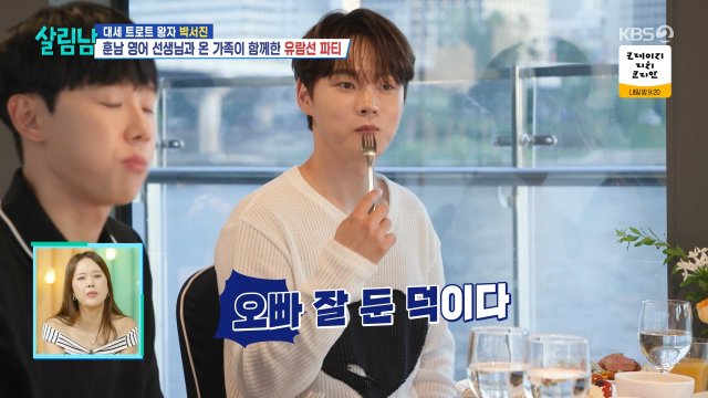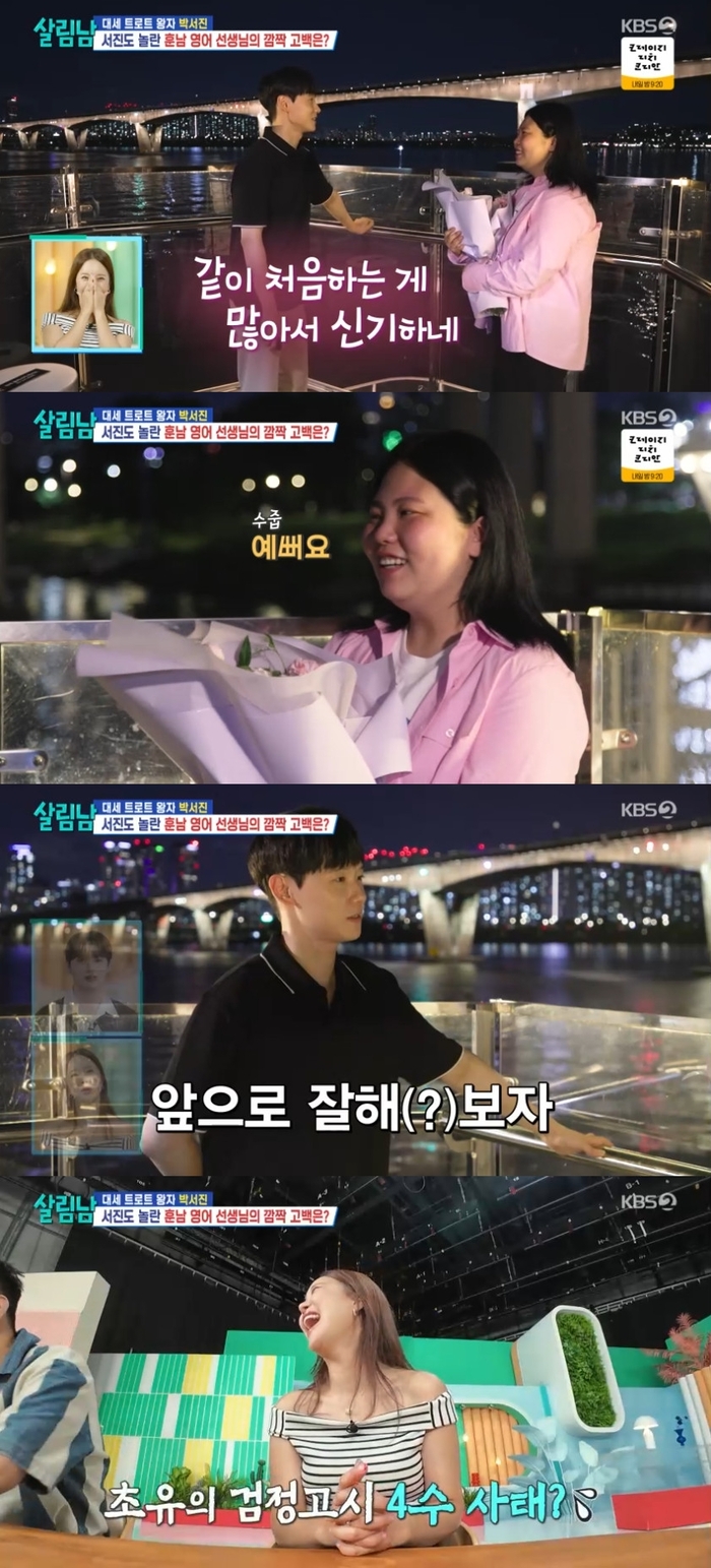 ‘살림남’.사진lKBS박서진여동생효정이영어과외쌤과재회했다.26일오후방송된KBS2‘살림하는남자들시즌2’(이하‘살림남’)에는유람선에서효정의27번째생일파티가벌어졌다.이날방송에서는효정의과거짝사랑남인영어과외쌤(코디쌤)이생일파티에초대됐다.선상파티후코디쌤은효정에게따로꽃다발을선물했다.코디쌤이“생일축하하느라선물할타이밍을놓쳤어”라고하자효정은“예뻐요”라며수줍어했다.코디쌤은불편하진않았냐는효정의질문에“특별한날함께해서좋았어.같이처음하는게많아서신기하네”라고답했다.이어코디쌤이“앞으로잘해보자”라며의미심장한말을남기자은지원은“이건4수다”라며효정이또한번검정고시에서떨어지는것아니냐며걱정했다.‘살림남’은매주토요일오후9시15분에방송한다.[서예지스타투데이객원기자]Copyright©스타투데이.무단전재,재배포및AI학습이용금지