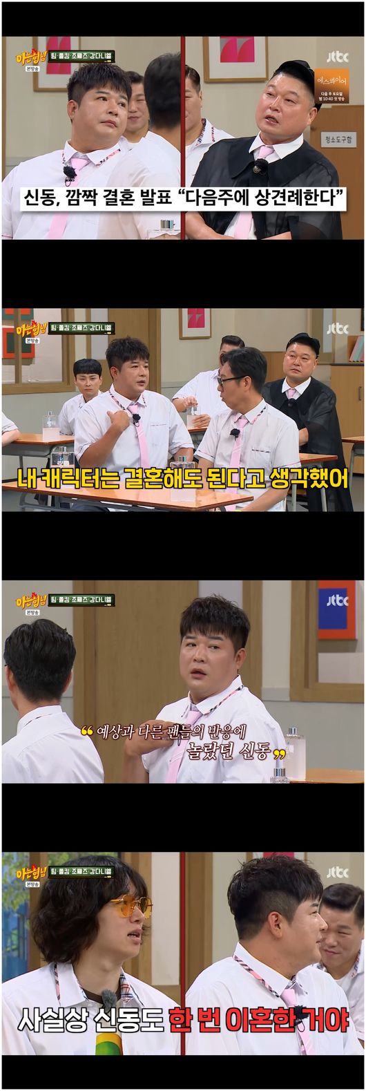 [OSEN=오세진기자]‘아는형님’슈퍼주니어신동이과거결혼발표를했던것에대해조심스러운입장을표명했다.26일방영한JTBC예능‘아는형님’에서는가수팀,조째즈,폴킴,강다니엘이등장했다.이중팀과폴킴은유부남이었는데,이들은각각8년과9년열애끝에결혼한것으로알려졌다.폴킴은“아내랑9년연애했다.장기연애를하니까주변에서다들결혼안하냐고다들물어봤다”라면서“그런데장모님이한번은밥먹자고하시더라.그래서셋이서밥을먹는데‘3년안에결혼안하면죽여버린다’라고하셨다”라고말했다.이후결혼을결심했지만주변으로부터'솔로남자가수의결혼여부는팬층을달리한다'라는식의말을들은그는고민에빠졌다고.그러나폴킴은“결혼발표다음날행사를갔더니팬들이‘결혼축하해’라고하시더라.나는도대체무슨생각을하고살았던걸까”라며쑥스럽다는듯웃었다.이에신동은“내캐릭터가결혼을해도된다고생각을했는데,팬들이화를내는거보고깨달았다”라며조심스럽게말문을열었다.그러자김희철은“사실신동은한번이혼한거지”라고말해스튜디오를뒤집어놓았다./[email protected][사진]JTBC예능‘아는형님’Copyright©OSEN.무단전재및재배포금지.
