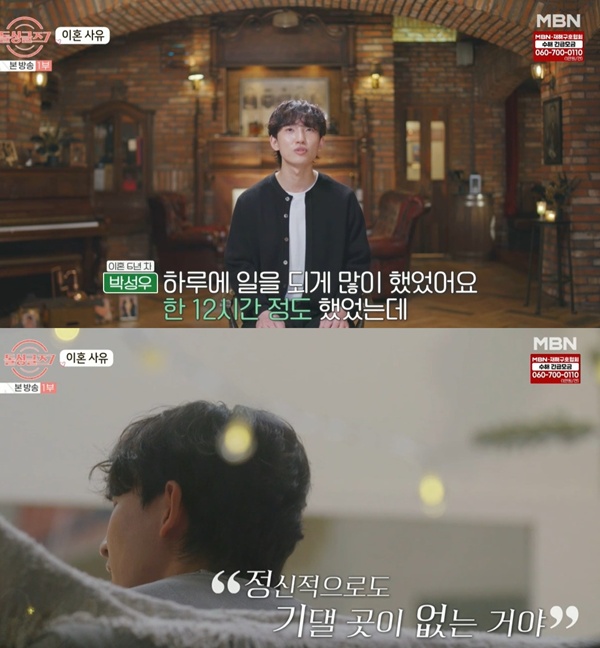 돌싱글즈7/사진=MBN캡처[스포츠투데이임시령기자]'돌싱글즈7'출연자들이이혼사유를털어놨다.27일방송된MBN예능프로그램'돌싱글즈7'에서는돌싱남녀들이이혼사유를털어놓는모습이그려졌다.이날이혼6년차박성우는"경제적인게컸다.장인장모랑같이살았다.네명이서사는데경제적으로어려워일은무엇이든다했다"고말했다.이어"경제적으로책임을다하려고노력했다"며"처음창업해서1년쯤폐업을하게돼빚이있었다.빚은갚으려고하루에12시간정도일을했다.하다보니까몸이지쳤다.돈을갚는게전부였고모으거나쓰는돈이거의없었다"고털어놨다.그러면서"일을다녀오면쉬고싶어지는마음을몰라주더라.정신적으로기댈곳이없었다"며처가식구들을케어하며지냈다고밝혔다.박성우는"퇴근하고집에걸어서들어가는데들어가는길이너무힘들었다.골목길에들어가서울기도했다.기댈곳이없고의지할곳이없네생각했다.너무고독하고외로웠었던것같다.그렇게합의이혼으로끝이났다"고고백했다.[스포츠투데이임시령기자[email protected]]Copyright©스포츠투데이.무단전재및재배포금지.