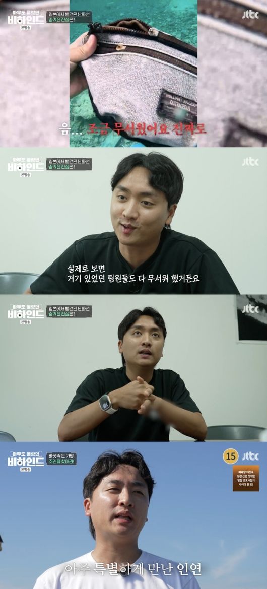 [OSEN=임혜영기자]바닷속에서발견된의문의가방이호기심을자아냈다.29일방송된JTBC'아무도몰랐던,비하인드’에서는일본에서발견된난파선과관련한이야기가공개되었다.제보자는“올6월에일본으로프리다이빙투어를갔다.산호가예쁜포인트가있다”라고말문을열었다.프리다이빙을즐기던중한국난파선을발견하게된것.그순간제보자의시선을사로잡은물건이있었다.출입문에걸려있는작은가방.제보자는“조금무서웠다.돌아가신분의물건일수도있고”라고당시의상황을회상했다.그는“도의적으로갖고오거나손대는것자체가죄짓는느낌도들었다”라며황급히가방을제자리로돌려놨다고밝혔다.알고보니난파선은제주도에서출발한136다누리호였다.올해1월항구를떠난136다누리호는며칠만에전복되었다는소식을전했다.제보자는“제가손을댔으니마무리를지어야겠다고생각했다”라며현지인의도움으로작은가방을돌려받을수있게되었다고밝혔다.가방의주인은인도네시아에서온선원이었다.이후제보자는가방의주인을찾기위해제주도로향했다.제보자는발품을팔며외국인찾기에나섰다.외국인은다행히살아있었고현재작업을위해배를타고나간상황이라고밝혔다.침몰당시선원들은바다에몸을던졌고인근에서조업하던어선이모두를구했다고.제보자는“배사고가있었음에도불구하고바로배를타고조업을나갔다는걸들으니마음이조금그렇다.특별한인연이니이지갑만큼은제손으로꼭전달해드리고싶다”라고말했다./[email protected][사진]JTBC'아무도몰랐던,비하인드'Copyright©OSEN.무단전재및재배포금지.