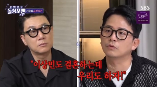 (엑스포츠뉴스오수정기자)'돌싱포맨'에서이상민의신혼집이공개됐다.29일방송된SBS예능프로그램'신발벗고돌싱포맨'에서는박소현,이은지,미주가출연해이야기를나눴다.이날방송에서탁재훈,임원희,김준호는이상민의진짜신혼집방문에"예전이랑비슷한것같은데?"라면서질투를했다.살짝공개된이상민의신혼집은탁트인씨티뷰를자랑했다.김준호는"상민이형성공했다"면서"형이결혼하고나서유행처럼번지는게'이상민도하는데우리도하자'고생각하시는분들이많더라"면서웃었다.이상민은"(윤)정수형도결혼한다더라"고했고,이에임원희는"다결혼을하네"라고했고,특재훈역시"못난이들,다결혼하네"라며씁쓸해했다.이에이상민은"2026년생연예인2세가정말많을것같다"면서혼자만신나해웃음을줬다.사진=SBS방송화면오수정기자[email protected]©엑스포츠뉴스.무단전재및재배포금지.