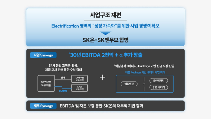 SK온-SK엔무브합병과사업구조재편.(자료=SK이노베이션)SK이노베이션이자회사SK온과SK엔무브합병을결의했다.유상증자를기반으로총8조원규모자금조달도추진한다.대규모적자에시달리고있는SK온의재무구조를개선하기위한조치로,배터리사업을포기하지않겠다는SK그룹의지로풀이된다.SK이노베이션·SK온·SK엔무브는30일각각이사회를열고,SK온과SK엔무브합병안건을의결했다.SK온이SK엔무브를흡수합병하고,합병법인은오는11월1일출범한다.SK이노베이션이두자회사를합치는건SK온재무건전성악화때문이다.SK온은지난2021년10월독립법인출범이후누적적자규모가3조원이상에달한다.반면SK엔무브는2021년이후3년연속1조원안팎의영업이익을기록한'알짜'계열사다.SK엔무브와합병은SK온재무안정성을확보하려는포석이다.지난해SK이노베이션과SKE&S합병과궤를같이하는두번째사업재편이다.SK이노베이션경영진이30일서울종로구SK서린빌딩수펙스홀에서열린'2025SK이노베이션기업가치제고전략설명회'에서발언하고있다.(왼쪽부터)추형욱SK이노베이션대표이사사장,장용호SK이노베이션총괄사장,이석희SK온사장,김원기SK엔무브사장.(사진=SK이노베이션)SK이노베이션은이번합병으로자본1조7000억원,상각전영업이익(EBITDA)8000억원등의재무구조안정화효과가나타날것이라고밝혔다.사업측면에서도SK온배터리와SK엔무브액침냉각기술등을결합,시너지효과를창출할수있다고강조했다.이석희SK온사장은이날서울종로구SK서린빌딩에서열린설명회에서“통합법인은안정적인성장으로기업가치를제고할것”이라며“2030년에는EBITDA10조원이상을달성하고부채비율은100%미만으로유지,단단하고내실있는회사로거듭나겠다”고강조했다.합병법인은당분간기업공개(IPO)를추진하고않고,사업경쟁력강화에집중할방침이다.당초SK온은내년말까지IPO를성사시킨다는계획이었으나,이변합병으로백지화됐다.장용호SK이노베이션총괄사장이30일서울종로구SK서린빌딩수펙스홀에서열린'2025SK이노베이션기업가치제고전략설명회'에서발표하고있다.(사진=SK이노베이션)장용호SK이노베이션총괄사장은“이번합병으로SK온과기존재무적투자자(FI)간주주계약이해지된다.IPO의무화가사라지는것”이라며“당분간은수익성강화에집중해야하는시기로,합병법인IPO계획은없다”고말했다.SK이노베이션은대규모자본확충에도나선다.SK이노베이션은2조원규모제3자유상증자와7000억원영구채발행을추진한다.SK온과배터리소재자회사SK아이이테크놀로지(SKIET)는각각2조원과3000억원의유상증자를추진한다.SK이노베이션은연말까지3조원자본도확충,총8조원을조달한다는계획이다.다만대규모유상증자로기존주주들의지분가치희석우려는높아질전망이다.SK이노베이션은이를통해순차입금규모를9조5000억원이상줄일수있을것이라고전망했다.2030년에는EBITDA20조원,순차입금20조원미만달성을목표를제시했다.장총괄사장은“수익성과성장성을모두갖춘SK이노베이션으로거듭날것”이라고밝혔다.이호길기자[email protected]©전자신문.무단전재및재배포금지.