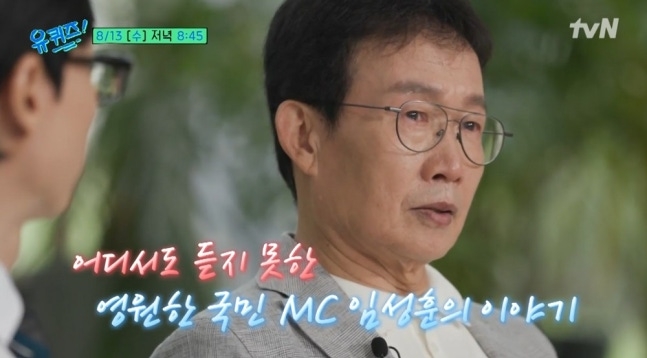 ‘유킈즈’에출연한국민MC임성훈.사진ㅣtvN국민MC임성훈(71)이데뷔50년만에처음으로토크쇼에출연한다.7일공개된tvN‘유퀴즈온더블럭’예고편에는“MC계의레전드임성훈,데뷔후첫토크쇼출연!”이라는문구와함께임성훈의출연이예고됐다.이날유재석은임성훈을향해“가수조용필의진짜절친은처음본다”라고말했다.이에임성훈은“가요톱10을녹화할때일주일에한번씩(조용필과)만났는데끝나면항상당구를쳤다”고에피소드를전했다.임성훈은이날“방송을50년했지만토크쇼는처음”이라며‘유퀴즈’출연에대한감회를밝혔다.이어“박소현씨와함께26년간진행한순간포착세상에이런일이로기네스북에도등재됐다”고말했다.그러나오랜시간이끌어온프로그램은최근휴식기에들어가며자연스럽게MC자리에서내려오게됐다.그는당시의상황을회상하며“내일이‘순간포착’녹화였는데갑자기전화가왔다.낮에어머니의부고를들었다”며“이제는내가…그래,이제는…”이라는말과함께끝내눈시울을붉혔다.임성훈은1970년가수로데뷔해1974년코미디언으로활동을시작했다.이후KBS2‘가요톱10’MC로10년간활약했으며,1998년부터는SBS‘순간포착세상에이런일이’를통해오랜기간시청자와만나왔다.‘유퀴즈온더블럭’은오는13일오후8시45분방송된다.Copyright©스타투데이.무단전재,재배포및AI학습이용금지
