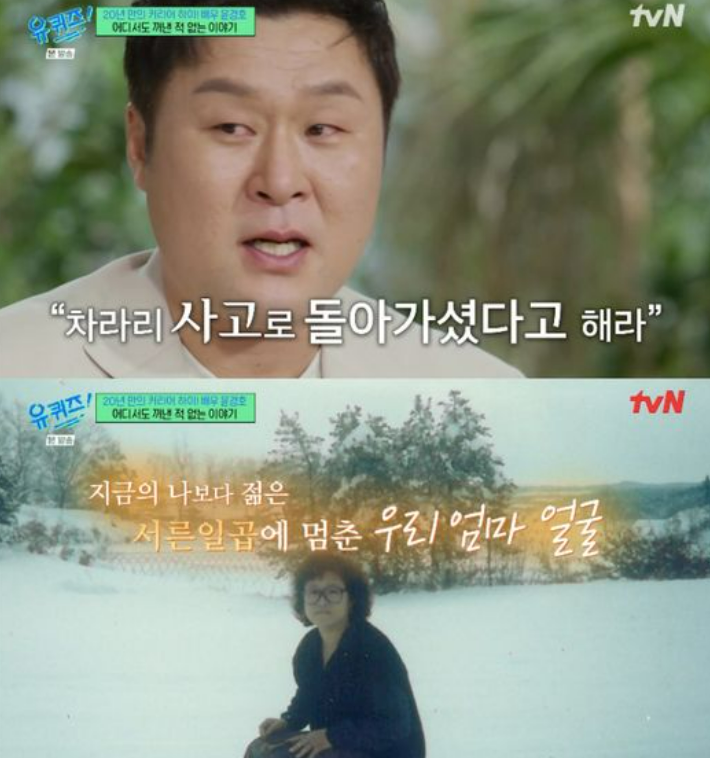 [스타뉴스|김노을기자]/사진=tvN방송화면배우윤경호가가슴아픈가정사를처음으로고백했다.6일방송된tvN예능프로그램'유퀴즈온더블럭'에는윤경호가게스트로출연했다.이날윤경호는"사실어디서한번도제대로이야기꺼낸적없었는데여기는다시못올자리니까말씀드리겠다"고조심스럽게입을열었다./사진=tvN방송화면그는"엄마가되게저를많이의지하고친구처럼지냈다"며"돌이켜보면엄마야말로저의유일한친구였던것같다.그러다저한테사춘기가오면서다른친구들과더어울리게되고엄마가어느순간귀찮아졌다"고말했다.이어"엄마는항상제얘기를기다리는데그게너무부담스럽기도하고친구들이랑더놀고싶었다.아이들이사춘기가오면부모에겐사추기라고또다른외로움이찾아온다고하더라.어느날엄마가'엄마한테사추기가왔나봐.너랑더얘기하고싶어'라고하셨는데알고보니우울증이심하셨던것같다"고털어놨다.윤경호는"우울증을못이기시고결국엔스스로생을마감하셨다"고밝히며눈물을쏟았다./사진=tvN방송화면또한"사실은그런아픔들이있는분들이많이계시지않나.당시외할머니도제게'엄마가그렇게돌아가셨다는얘기를밖에서하면사람들이널흉볼수있으니차라리사고로돌아가셨다고얘기해라'고말씀하셨다.그래서한번도엄마가아떻게돌아가셨는지얘기할수없었다"고전했다.그는"항상좋은일좋은자리가생기면가장많이생각나는게엄마"라며"다른사람들과대화하고,아내와대화하고그렇게지내도항상기쁨뒤공허함이찾아왔다.채워지지않았다"고힘든속마음을고백했다.그러면서"지금도기쁘고자랑스럽지만이걸들려드릴사람이없어서늘공허함이있다"고덧붙여먹먹함을안겼다.김노을기자[email protected]©스타뉴스&starnewskorea.com,무단전재및재배포금지