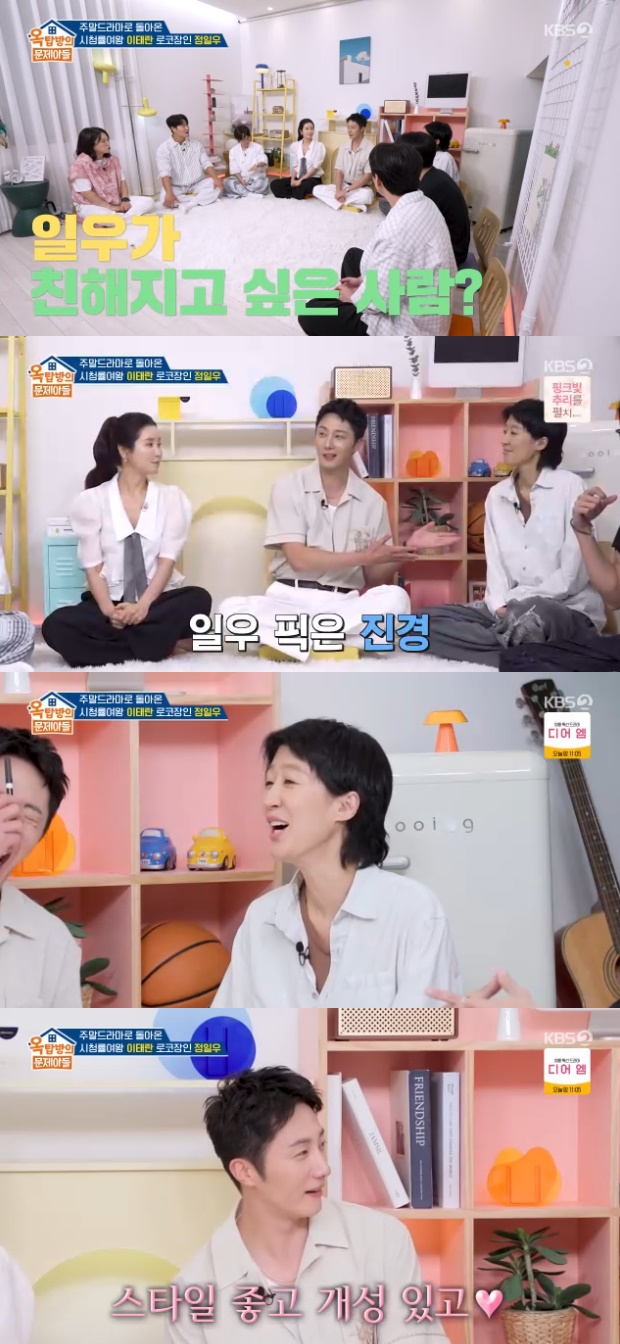 티브이데일리포토[티브이데일리김진석기자]'옥탑방의문제아들'정일우가홍진경과친해지고싶다고말했다.7일방송된KBS2예능프로그램'옥탑방의문제아들'(이하'옥문아')에는배우이태란과정일우가게스트로출연해입담을뽐냈다.이날김숙은동갑내기배우이태란과친해지고싶다는의사를표했고,이태란또한동갑내기와친해지고싶다는의사를전했다.이에더해정일우는친해지고싶은'옥문아'멤버로홍진경을꼽았다.홍진경은이유를물었고,정일우는"사업할때추진력이강하다"라고대답했다."진취적인사람이좋다"는정일우에주우재는"동업하실거냐"라고물었고,김숙도"김치사업하고싶냐"라고더해웃음을더했다.이에더해정일우는최근회사를운영하게됐다고털어놨다.그는"저희집가훈이'진취적인사람이되자'다.계속배우만하다가회사를운영하는삶은다르더라"라며"외적인건크게중요하지않다.누나가매력이있다"라고말했다.홍진경은"진취적인거그만말해라.내가개선장군이냐"라고말해웃음을더했고,정일우는홍진경의유튜브도출연하고싶다고털어놔진심임을전했다.홍진경의유튜브'찐천재'에는배울것이있어야게스트로출연가능하다는사실에정일우는"요리를가르쳐주겠다"며자신이'달고나커피'의창시자임을밝혔다.정일우는수준급의요리실력을갖고있다고.이연복셰프에게까지배운일화를전한그에게홍진경은"김치까지담글수있냐"라고물었고,홍진경은"뭐하는사람이냐"라고일갈했다.이에더해정일우는"만두도빚는데,여름에는호박만두,겨울엔김치만두를빚는다.제가개발한만두도있다"라고밝히자홍진경은"왜그런걸개발하냐.연기만하지"라고받아쳐웃음을자아냈다.[티브이데일리김진석기자[email protected]/사진=KBS2'옥문아']옥탑방의문제아들[Copyrightⓒ*세계속에新한류를*연예전문온라인미디어티브이데일리(www.tvdaily.co.kr)/무단전재및재배포금지]Copyright©티브이데일리.무단전재및재배포금지.