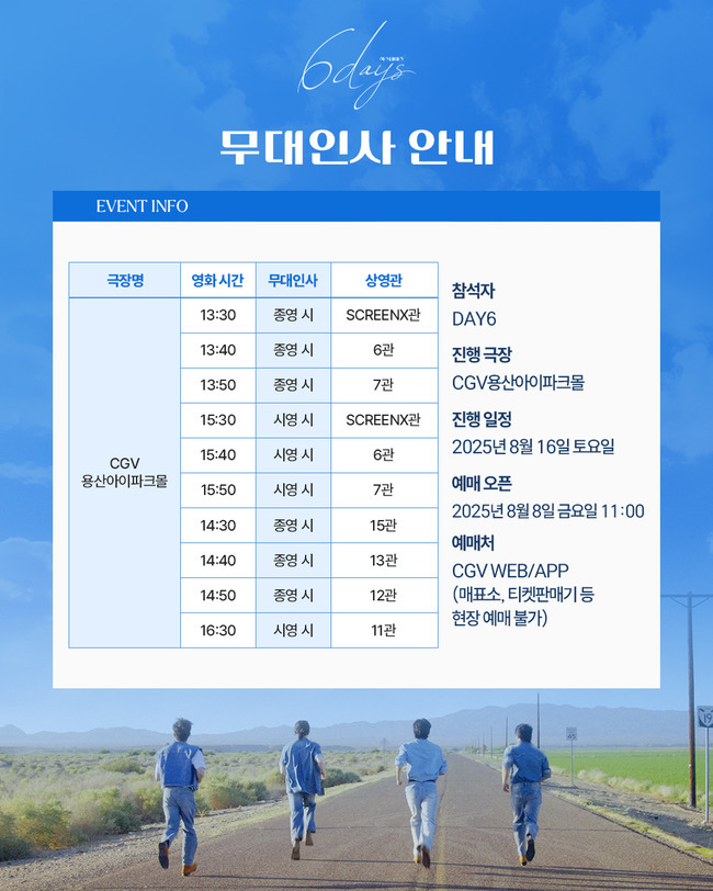 사진=CJ4DPLEX제공[뉴스엔황혜진기자]밴드DAY6(데이식스)가첫번째영화'6DAYS'무대인사를위해극장에뜬다.'6DAYS'는8월5일CGV왕십리에서DAY6멤버들이참석한프리미어시사회를통해첫공개됐다.이어8일오전11시개봉기념무대인사예매오픈이시작된다.음악과낭만을따라달린6일,DAY6의시네마틱여정을담은뮤직로드무비'6DAYS'는개봉을5일앞두고,영화관입장권통합전산망전체예매율5위,CGV전체예매율4위에올랐다.'6DAYS'는일본영화역대박스오피스오프닝1위를기록한'극장판귀멸의칼날:무한성편'을비롯해'좀비딸','F1더무비','악마가이사왔다'등쟁쟁한여름시장블록버스터작품에이어전체예매율5위를기록하며뜨거운반응을이끌어내고있다.특히CGV단독개봉작으로CGV전체예매율4위에오르며주목받고있다.이는9월7일데뷔10주년을맞이하는DAY6를향한MyDay(팬덤명:마이데이)의열광적인응원과SCREENX,4DX,ULTRA4DX특별관상영확정,여기에극장음향에최적화된사운드를통해전해지는DAY6의다채로운플레이리스트를토대로한반응이다.'6DAYS'는지난5일DAY6멤버들과황재석,종유석감독이참석한VIP시사회를통해처음으로관객들에게공개됐다.함께영화를관람한DAY6멤버들은무대인사를통해촬영당시의다채로운에피소드와기대감을표했다.먼저멤버YoungK(영케이)는“이번에영화라는새로운경험을할수있어서영광이었다.현장에서스태프분들과열정넘치게찍었는데정말빨리보고싶고기대된다”고말했다.성진은“이번에는영화배우로데뷔했다.(웃음)직접오프로드를달리면서운전을했는데,정말색다르고재미있었다.기대해주셔도좋을것같다”고특별했던촬영소감을밝혔다.원필은기억에남는에피소드에대해“저희네명이다현장에서와~하면서놀랐던게,하늘에별들이엄청빼곡히많았다.너무예뻤던기억으로남아있다”고이야기했다.마지막으로도운은“사실촬영당시온도가38도정도로무척더웠다.모든스태프분들이무더위에서도묵묵하게일하시는부분을보고,촬영뿐만아니라앞으로프로로서일을어떻게해야하는지에대해서도많이느낄수있었다”고열정가득했던촬영현장의소감을전했다.이밖에도DAY6멤버들은“낭만합격!”,“헬프미~”,“스틸롤링”등영화속화제의명대사들을언급하며화기애애한분위기를자아냈다.이와같은뜨거운열기에힘입어개봉기념무대인사가확정됐다.8월16일CGV용산아이파크몰에서진행되는이번무대인사예매는8일오전11시부터CGV홈페이지및모바일APP에서진행된다.현장매표소,티켓판매기에서는예매가불가하다.일반2D뿐만아니라SCREENX상영관에서도무대인사를진행하며색다른관람경험을선사할것으로기대를모은다.쟁쟁한블록버스터작품사이에서전체예매율TOP5에안착하며기대를더하고있는'6DAYS'의무대인사및영화이벤트에관련자세한내용은CGV홈페이지및모바일APP이벤트페이지에서,글로벌개봉과관련된소식은공식웹사이트에서확인할수있다.뉴스엔황혜진blossom@기사제보및보도자료[email protected]ⓒ뉴스엔.무단전재&재배포금지Copyright©뉴스엔.무단전재및재배포금지.