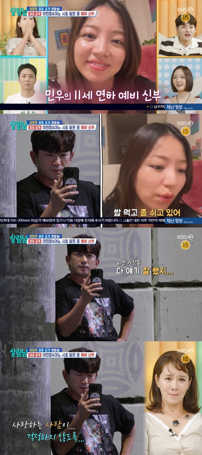 ‘살림남’.사진lKBS신화이민우가11세연하예비신부를처음으로공개했다.9일오후방송된KBS2‘살림하는남자들시즌2’(이하‘살림남’)에서이민우가결혼한다고밝혔다.이날방송에서이민우는부모님과대화후예비신부에게전화했다.시부모님반응이어땠냐는예비신부의질문에이민우는“다얘기잘됐지.걱정안해도돼.엄마,아빠가아주좋은말씀많이해주셨어”라고하얀거짓말을했다.앞서이민우부모님은“입밖으로안나오더라고.영미(민우누나)가할말이많아.같이못살아.말도안되는소리야.살수가없어”라며부정적인말을했던터.이민우의하얀거짓말을들은예비신부는“다행이다.부모님이괜찮으시면우리는너무좋아”라며밝은표정을지었다.민우는“힘내서잘살아보자!화이팅”이라며예비신부와함께할미래를그렸다.‘살림남’은매주토요일오후9시15분에방송한다.[서예지스타투데이객원기자]Copyright©스타투데이.무단전재,재배포및AI학습이용금지