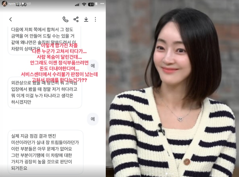 서효림[티브이데일리한서율기자]배우서효림이보험처리를미루는보험사에분개했다.서효림은9일본인의인스타그램에손해보험회사와나눈녹취록일부를게재했다.서효림은침수차를두고불법거래를유인하는손해보험사에대한이야기를다룬한기사를공유하며"전손처리안해주려고끝까지우기는이유가이런이유였던건가"라고의문을제기했다.그는"귀책사유없다면서3주째왜(처리를)안해주는거냐.너희회사는고객들돈받아서운영하는거라돈많아서이정도보상은아무것도아니며이거한건한다고해서크게피해보는일도아니라하지않았냐"라고불만을표했다.서효림은침수된차량에대한판매금을합쳐보상금을전하겠다는보험사의녹취록을공개하며당혹감을표했다.그는"침수차는보통폐차해야한다고알고있었는데아닌가.서비스센터에서수리불가판정이났는데고쳐서판매한다는건가"라며"사람목숨이달린건데이렇게망가진차를다른누군가고쳐서타다가"라며걱정을드러냈다.서효림은"자연재해는사람을가려서오는게아니고그게내가족또는내가될수있는거다.그걸로이미고통을겪고계시는분들도많고가족을잃으신분들도많다.당사자가아니면모르는그트라우마는엄청나다.이번일을겪으면서후처리하면서또다른하나를알게됐다.피해자가죄인취급을받는느낌이다"라고심경을전했다.그러면서"저는하나씩따져보고부당하다고얘기하고이렇게말이라도할수있는데연로하신분들이나어딘가조언을들을수없는분들은손해보험사와다투다가힘들어서포기하게된다.나도무력하게만드는데잘모르시는분들은어떨지화가났다.보험가입할때는전화한통도없고너무쉽게다른사람이가입해도문제가되지않는시스템인데보상받을땐왜이렇게증명하라고하나"라며답답함을드러냈다.[티브이데일리한서율기자[email protected]/사진출처=서효림SNS]서효림[Copyrightⓒ*세계속에新한류를*연예전문온라인미디어티브이데일리(www.tvdaily.co.kr)/무단전재및재배포금지]Copyright©티브이데일리.무단전재및재배포금지.