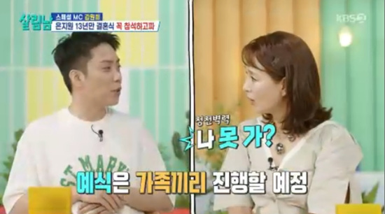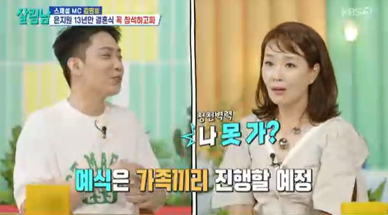 [스타뉴스|김나라기자]왼쪽부터은지원,김원희/사진=KBS2TV'살림하는남자들시즌2'캡처'살림남'404회'살림하는남자들시즌2'(이하'살림남')에서탤런트김원희가젝스키스리더은지원의재혼을축하했다.9일오후방송된KBS2TV'살림남'404회에는김원희가게스트로출연,MC은지원과13년만에재회한모습이그려졌다.두사람은2012년막을내린MBC'놀러와'에서호흡을맞춘인연이있다.이날오프닝에서은지원은김원희가"좋은소식있지않냐"라는언급에"(결혼을)또하게됐다"라고수줍게얘기했다.그러자김원희는"할때됐다.(은)지원이가4차원같지만속도깊고괜찮은후배이다.방송보면혼자있는게안타까웠다.혼자있고하면삶이외로워진다.적기에너무잘된거같아서축하해주러나왔다"라고자신의일처럼기뻐했다.그러면서김원희는"청첩장주냐"라고물었고,은지원은"그런거없다.가족끼리식을올린다"라고정중히말했다.하지만김원희는"나못가?근데1회때도못갔다"라고폭탄발언을해은지원을당황케했다.은지원은"1회라니요"라고발끈했고김원희는"너무잘살거다"라고응원을보냈다.'살림남'은매주토요일오후9시20분에방송된다.김나라기자[email protected]©스타뉴스&starnewskorea.com,무단전재및재배포금지