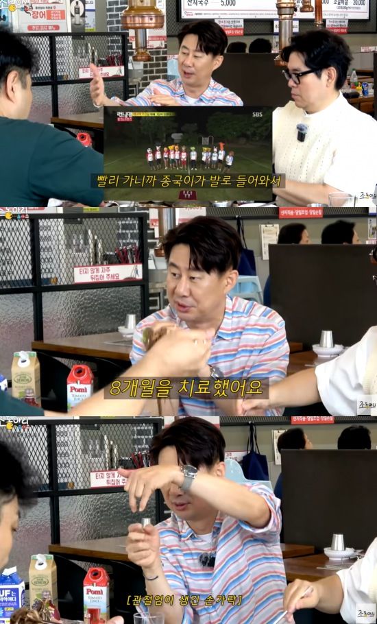 [서울=뉴시스]남희석.(사진=유튜브채널'조동아리'캡처)[email protected]*재판매및DB금지[서울=뉴시스]전재경기자=개그맨남희석이과거SBSTV예능'런닝맨'출연당시김종국과의축구경기에서부상당한일화를공개했다.남희석은최근유튜브채널'조동아리'에게스트로출연해개그맨김용만,지석진,김수용과함께다양한이야기를나눴다.남희석은대화중김용만을향해"형,그렇게운동하면서다리끊어지고그래도또축구하러가지않냐"며축구열정을치켜세웠다.이에지석진은김용만을두고"애유리발아니냐"고말해웃음을자아냈다.지석진은"희석이가예전에'런닝맨'와서뒤집어놨다"며그의활약을언급했다.남희석은"그날밤게임을하다가축구공을가운데두고먼저잡는상황이있었는데,나랑(김)종국이가붙었다.내가빨리들어가니까종국이가발로들어와서손가락이꺾였다"고회상했다.이어"손가락이그렇게다쳐서8개월이나치료를받았다.이후관절염생겼다"며다친손가락을직접보여줬다.이야기를들은지석진은놀라며"야,진짜?나진짜몰랐다"고반응했고,남희석은"치료를되게많이받았는데도오래가더라"고말했다.☞공감언론뉴시스[email protected]©뉴시스.무단전재및재배포금지.