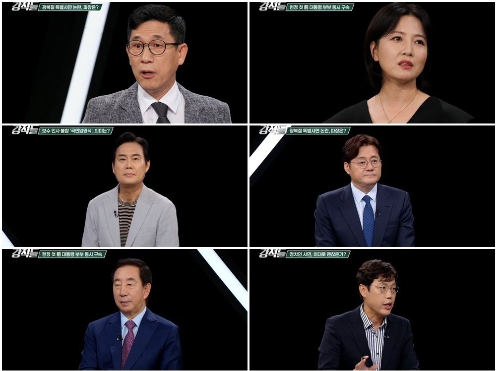 TV조선지난16일방송된TV조선‘강적들’에서는진중권교수진행으로홍익표전더불어민주당원내대표,김성태전국민의힘원내대표,김규완전CBS논설실장,김준일전경향신문기자가이재명대통령취임이후첫국민임명식부터조국과윤미향·사면논란,초유의전직대통령부부동시구속사태와국민의힘전당대회혼란까지,대한민국정치권을뒤흔드는핵심쟁점들과관련해공방을펼쳤다.먼저이재명대통령의국민임명식이보수정권전직대통령들과국민의힘,개혁신당의불참으로반쪽취임식이된상황을두고김규완평론가는“국민통합의의미를살려야되는데,그들만의리그,그들만의잔치여서아쉬웠다”라고지적했다.김준일전기자는“어떤식으로든명분을대서국민의힘은안나왔을가능성이높다”라면서도“정청래대표가‘악수도하지않겠다하며사태를악화시킨것도영향을미쳤던것같다”고분석했다.이재명대통령의지지율이취임후최저치를기록한가운데,조국전대표와윤미향의원의사면논란이지지율하락에영향을끼쳤다는평가또한이어졌다.김규완평론가는“조국사면은이재명대통령자신을위한것도있는것같다”는날카로운한마디를던지며“본인이받은검찰수사가부당했고,조작된수사였다는정치적효과를고려했다고본다”라고말했다.홍익표전의원은“어쨌든국민들께서다시한번기회를준것”이라고했지만,진중권교수는즉각“국민들이기회를준건아니다.잘못을끝까지부정하지않았냐”라며“저런식으로대학보내는게정상이되는거다.저는이게참담하다.조국사태는한국사회가사실상신분제사회라는것을확인한것”이라고주장했다.김규완평론가또한“문재인대통령의요청이워낙강력했던걸로안다”라고귀띔하며“이번사면을통해이재명대통령은전임정부에대한빚을다갚고마이웨이를선언한것”이라고평가했다.김준일전기자는“허니문은끝났다”라고일갈한후“사면으로인한정치적후폭풍이있다”라며“앞으로지지율50%선을지키는것이험난한과제가될것”이라고전망했다.이어헌정사상초유,전직대통령부부의동시구속사태에쟁점이맞춰졌다.홍익표전의원은“김건희특검이라불릴정도로김건희부인의독단적범죄영역이존재했다고보는거니구속은불가피했다”라고말했고,진중권교수또한“과하지않다고본다.변명할여지가없다”며입을모았다.김규완평론가는“부부구속이과하다는데남매구속,모녀구속사태까지올수있다”라고경고했다.김준일전기자는“빙산의일각일수있다.국민의힘내부에서다알면서제어하지못한것이이사태의핵심”이라고정곡을짚었다.진중권교수는김건희여사와직접통화했던일화를밝히며“김여사가‘내가뭘하면좋겠냐’고물어내가‘아무것도하지말라’고했다”라고말한데이어“절대이사람저사람만나러다니지말고전화해서이런저런얘기하지말라고했다.다녹음하고있을거고,2,3년지나면터져나올거라고얘기했는데”라며안타까움을전했다.김성태전의원은“단순히김여사의범죄로치부되는사안이아니다.이문제로보수가회복하기어려운상황까지가게될것”이라며씁쓸해했다.국민의힘전당대회가전한길을중심으로혼란과분열양상에휩싸인현실도도마위에올랐다.김규완평론가는“당내많은의원들이전한길을찾아와자제를하라고설득을해받아들인것으로안다”라는비하인드스토리를밝혔고,김성태전의원은“전한길이전당대회당락까지영향끼치는현실이참담하다”라고자조했다.홍익표전의원은“우스갯소리로국민의힘에서여사,법사,검사에이어강사시대가됐다라고하더라”라는농으로모두를빵터지게했다.진중권교수는“정치인사면은없어야한다”고주장하며“사법부에서유죄판결을받아도정치적수단을통해벗어날길이열려있다.국민대다수는법의지배아래사는데,그누군가는법위에살게되는것”이라며“사면권은국민통합이아닌분열의결과만낳았다.앞으로는제한이필요하다”고강조했다.이날‘강적들’은임명식불참에서부터전직대통령부부의동시구속,여권의당내혼란까지정치권을뒤흔든논란들을다뤘다.손봉석기자[email protected]©스포츠경향.무단전재및재배포금지.