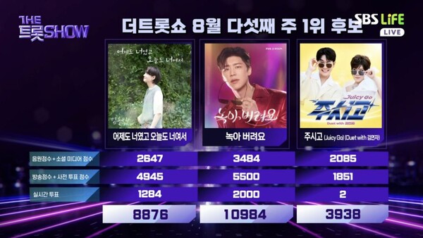 ⓒSBSLife'더트롯쇼'[스포츠한국김현희기자]가수박지현이'더트롯쇼'1위트로피를하나더추가했다.25일방송된SBSLife'더트롯쇼'에서는8월다섯째주1위후보로김용빈'어제도너였고오늘도너여서',박지현'녹아버려요',영탁'주시고'(Duetwith김연자')등이올랐다.실시간투표점수를합산한최종결과1위는박지현'녹아버려요'가차지했다.'녹아버려요'는방송점수와사전투표점수5500점만점,실시간투표2000점만점을받았고,음원점수와소셜미디어점수3484점을합산해총1만984점을기록했다.2위는8876점의김용빈'어제도너였고오늘도너여서',3위는영탁'주시고'에게돌아갔다.한편이날'더트롯쇼'에는김용임,김용필,김의영,류연주,마이진,박민수,박성온,박지후,안성훈,안지완,윤태화,이수연,지원이,대왕마마,김다현,서지오,성민,양지은,황윤성등이출연했다.스포츠한국김현희기자[email protected]©스포츠한국.무단전재및재배포금지.