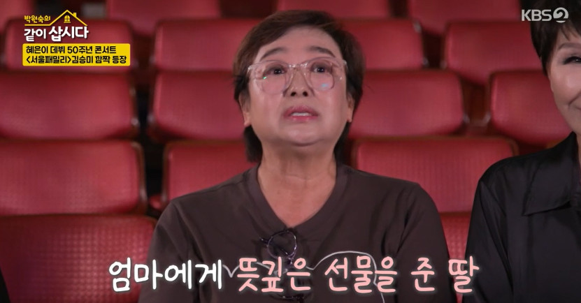 KBS2TV‘박원숙의같이삽시다’KBS2TV‘박원숙의같이삽시다’KBS2TV‘박원숙의같이삽시다’KBS2TV‘박원숙의같이삽시다’[뉴스엔하지원기자]가수혜은이가데뷔50주년콘서트를열게된배경을전했다.8월25일방송된KBS2TV'박원숙의같이삽시다'에서는데뷔50주년을맞은혜은이의콘서트가공개됐다.이날박원숙,홍진희,윤다훈은대학로공연장을찾아리허설중인혜은이를만났다.오랜준비탓에다소수척해보였지만혜은이는“공연을하니까살아있는것같다.어제도감동의도가니였다”라며벅찬마음을드러냈다.혜은이는"50주년이니까기념적인공연을할까했는데용기가안났다.딸과사위가자기들이제작을하겠다는거다.엄마한테선물하고싶다고해서하게됐다"고이야기했다."사위를잘얻었다"는말에혜은이는"사위도장가를잘온거다"고너스레를떨었다.뉴스엔하지원oni1222@기사제보및보도자료[email protected]ⓒ뉴스엔.무단전재&재배포금지Copyright©뉴스엔.무단전재및재배포금지.