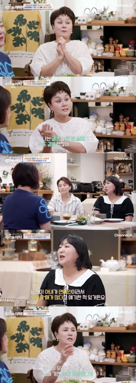 [OSEN=임혜영기자]이경실이이혼한전남편에게미안한마음을드러냈다.25일방송된채널A‘절친토큐멘터리-4인용식탁’(이하4인용식탁)에는이경실이출연,절친요리연구가이보은,개그우먼이수지를초대해이야기를나누었다.이날이경실은이수지에게“젊을때마음껏사랑해라.너무일에치우치지마라.내가한번실패하고또결혼을했다.첫번째결혼때너무바빴다.그게최선을다해서잘사는건줄알았다.남편입장에서는나한테바쁘게살아달라고한게아닌데‘그사람이외로웠겠다’생각이든다”라고진심으로조언을건넸다.이수지는“남편이아내가연예인이라서외로울때가많다고얘기한적이있다.일하는시간이남편의배려라는게느껴졌다.그래서같이있을땐최대한표현하려고한다”라고말했다.또이수지는“균형잡기가어려운데남편,아기에게미안한부분을어떻게채웠는지궁금하다”라고물었고,이경실은“그때는나도일이우선이었다.친정엄마가우리집에오시면서애들도키워주셨다.애들걱정도안했다.오로지내일만열심히했다"라고자신의경험을털어놨다.이어"일하고나서집에들어가면지친다.우리애들이지금커서얘기하는데엄마하고같이보낸시간이없었던것같다고”라고아쉬움을드러내기도했다./[email protected][사진]채널A‘절친토큐멘터리-4인용식탁’Copyright©OSEN.무단전재및재배포금지.