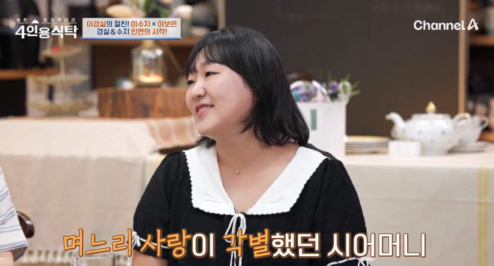 ‘4인용식탁’.사진|채널A개그우먼이수지가이경실에대한고마움을드러냈다.25일방송된채널A예능프로그램‘절친토큐멘터리-4인용식탁’(이하4인용식탁)에는이경실이출연했다.이날이경실은E채널예능프로그램‘개며느리’를언급하며“코미디언중시어머니가된사람이없었다.우리아들이날시어머니로만들어줘서시어머니입장으로출연했다.그때이수지가같이출연했다”고이수지와인연을언급했다.그러면서“(이수지의)시어머니가그렇게마음에들더라.수지를너무예뻐하신다.시아버님도너무좋으신분”이라고이수지가족을언급했다.이수지는“(이경실이)저희고부관계를너무예뻐하셨다.저희어머님이그거촬영하시고돌아가셨다.선배님을생각하면어머님이떠오른다”면서“어머님이돌아가셨을때‘SNL’이라는코미디프로그램을하고있었다.혹시기사가나서감정이들어가면본업에폐를끼칠까봐선배님한테만따로연락을드렸다”라고고마운마음을드러내며눈시울을붉혔다.[김소연스타투데이기자]Copyright©스타투데이.무단전재,재배포및AI학습이용금지