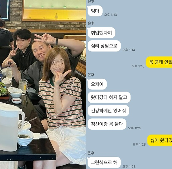 [스타뉴스|김나라기자]윤후,윤민수,김민지세가족/사진=윤후모친김민지씨인스타그램'윤후엄마'김민지씨가전남편윤민수와이혼후'동거'로화제를모은뒤근황을알렸다.윤후모친김민지씨는26일오후자신의인스타그램에"이슈된김에헤헤#아들자랑#오늘카톡#윤후"라는메시지를남겼다.이와함께공개한캡처사진엔아들윤후와의모바일메신저대화내용이담겼다.윤후는자나깨나엄마를걱정하는깊은효심으로,잘자란아이의표본을보여줬다.그는"잘갔다올게엄마"이라고인사를건넨뒤"건강만챙겨줘"라고전했다.또한윤후는엄마의'심리상담'취업사실을언급해눈길을끌었다.다만김민지씨는"응근데안하려고"라고알렸다.그러자윤후는어김없이"왔다갔다하지말고건강하게만있어줘.정신이랑몸둘다"라고엄마를각별히챙기는훈훈함을자아냈다.이들세가족은과거MBC'아빠!어디가?'에출연하며시청자들에게큰사랑을받았다.하지만윤민수와김민지부부는2006년결혼과윤후출산후,18년만인지난해이혼소식을전했다.이가운데윤민수가24일방송된SBS'미운우리새끼'에서김민지씨와이혼을했음에도여전히한집살이중인근황을밝혀다시금뜨거운화제를이끌었다.그이유에대해선"이혼기사가난건작년이지만정확하게서류정리는두달정도밖에안됐다.이혼후정리할부분들이많은데그중하나가집이매매가돼야한다는거다.그러다보니당분간같이지내게됐다"라고고백했다.김나라기자[email protected]©스타뉴스&starnewskorea.com,무단전재및재배포금지