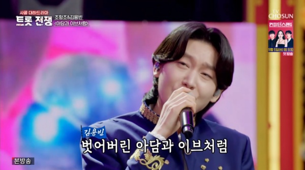 사랑의콜센타세븐스타즈/사진=TVCHOSUN캡처[스포츠투데이정예원기자]'사랑의콜센타세븐스타즈'김용빈이대선배조항조와무대에올랐다.28일방송된TVCHOSUN예능'사랑의콜센타세븐스타즈'(이하'사콜세븐')에서는'미스터트롯3'진(眞)김용빈이조항조와함께듀엣무대를선보이는모습이그려졌다.사랑의콜센타세븐스타즈/사진=TVCHOSUN캡처이날'사콜세븐'은'사콜대하드라마-트롯전쟁'특집으로꾸며졌다.게스트로는조항조가등장,후배가수들의열렬한환호를받았다.이내조항조의곡을연달아커버하는'조항조家메들리'가진행됐다.김용빈은파란슈트를입고무대에올라조항조의'때'를선곡해뛰어난가창력을선보였다.여기서끝이아니었다.김용빈은조항조는함께잊지못할무대를꾸미기도했다.두사람은나훈아원곡의'아담과이브처럼'을선곡,수십살의나이차를극복한멋진시너지를발휘했다.조항조는원로가수다운내공을유감없이발휘했고,김용빈은'젊은피'다운신선한에너지를자랑했다.무대가끝나자출연자들은기립박수를아끼지않았다.[스포츠투데이정예원기자[email protected]]Copyright©스포츠투데이.무단전재및재배포금지.