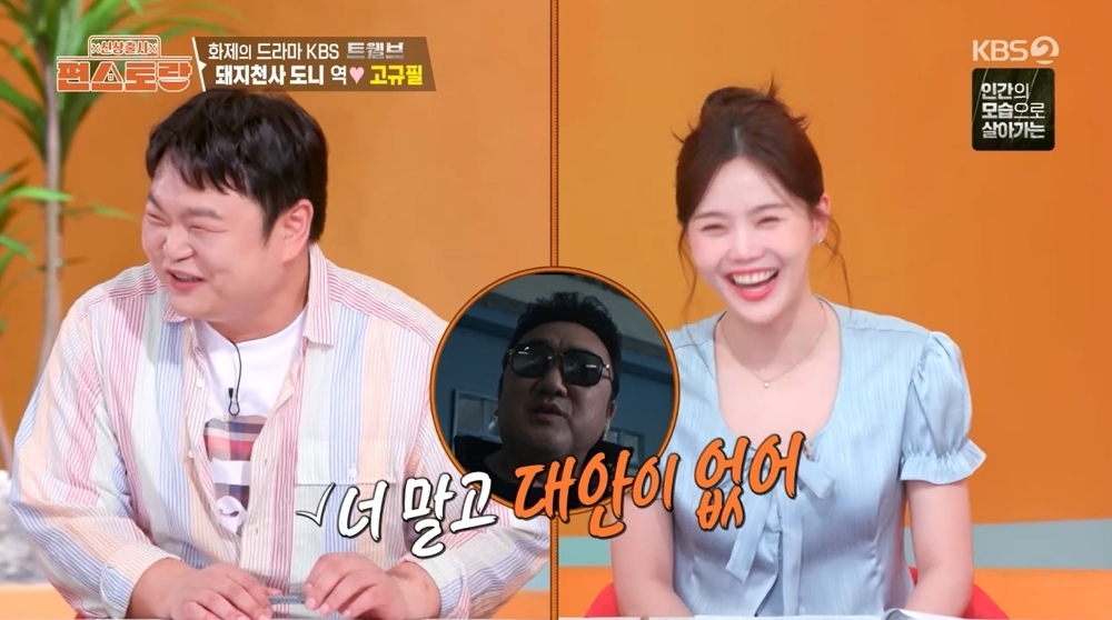 KBS2TV‘신상출시편스토랑’캡처KBS2TV‘신상출시편스토랑’캡처[뉴스엔박수인기자]배우고규필이'편스토랑'출연비화를밝혔다.8월29일방송된KBS2TV'신상출시편스토랑'에서는배우고규필이국민시식단으로출격했다.고규필은KBS2TV토일드라마'트웰브'를소개하며"동양의12지신을오마주해서12천사들이악당들을물리치는액션히어로물이다.저는(12천사중)돼지역할을맡았다.마동석선배님이전화를주셔서'돼지가나오는데너말고다른대안이없다'고하더라.기분이좋으면서도한편으로는기분이막좋지는않더라"고털어놨다."한번우겨보지.'형님이돼지하고내가호랑이할게'"라는이연복의말에는"활동오래하고싶다"고밝혔다.마동석과네번째작품을함께했다는고규필은"음식궁합도잘맞나"라는질문에"음식궁합이좋지는않다.선배님은떡볶이같은매운분식류를되게좋아하시는데저는매운걸못먹는다.요리하는건아직못봤다.포장지뜯는건엄청잘하신다"고답했다.뉴스엔박수인abc159@기사제보및보도자료[email protected]ⓒ뉴스엔.무단전재&재배포금지Copyright©뉴스엔.무단전재및재배포금지.