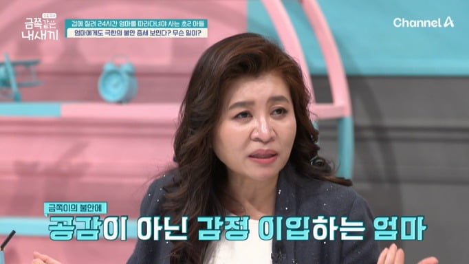[텐아시아=조나연기자]사진=채널A‘요즘육아-금쪽같은내새끼’사진=채널A‘요즘육아-금쪽같은내새끼’초2금쪽이가인플루언서엄마곁을한시도떨어지지못해눈물을보였다.29일방송된채널A‘요즘육아-금쪽같은내새끼’에서는초2아들을둔인플루언서엄마와보디빌더아빠가등장했다.이날방송에서겁에질러24시간엄마를따라다니는초2아들금쪽이의모습에오은영박사는"단순한분리불안이아니다.아동기공포불안장애다.아동기에가질수있는불안은다가지고있다"고설명했다.사진=채널A‘요즘육아-금쪽같은내새끼’사진=채널A‘요즘육아-금쪽같은내새끼’헬스장에서만나현재는귀여운두명의아들을키우고있는인싸부부.하지만외향형부모와반대로금쪽이는다른사람과눈도마주치지못했고,시선을피했다.급기야금쪽이는할머니와할아버지인사조차힘들어한다고.운동하는엄마를따라헬스장과일터인태닝숍도따라갔다.금쪽이엄마는"항상제곁에있으려고한다.죄책감때문에사업까지접을까고민했다"고털어놨다.이를본오은영박사는"초등학교2학년이라면불안을스스로조절할수있어야한다.현재는불안이너무높아일상생활이어려운심각한상태다"며"선택적함구증양상이있고,약물치료등전문적인도움이필요하다"고진단했다.사진=채널A‘요즘육아-금쪽같은내새끼’사진=채널A‘요즘육아-금쪽같은내새끼’사진=채널A‘요즘육아-금쪽같은내새끼’또한금쪽이엄마는"사실은잠자리에들기전이가장불안하다.옆에남편이랑아이랑같이자고있으면행복한상황인데아이가납치가되서제가잡으러가는장면이상상되고,전혀일어나지도않은일이떠오른다.이런적이많다"고불안을겪고있다고고백했다.이를들은오박사는"엄마도불안을이겨내려고운동하고,세게보이려고하고그런게있다.하지만하나만툭건드리면터질수있다"며"아이의불안에도공감이아닌감정이입을한다.그러면악순환이되는것이다"고덧붙였다.오박사는"금쪽이는서둘러서치료하지않을경우외부의자극을못견디고공포스러우니까자칫폐쇄은둔족이될수있다"고조언했다.조나연텐아시아기자[email protected]©텐아시아.무단전재및재배포금지.