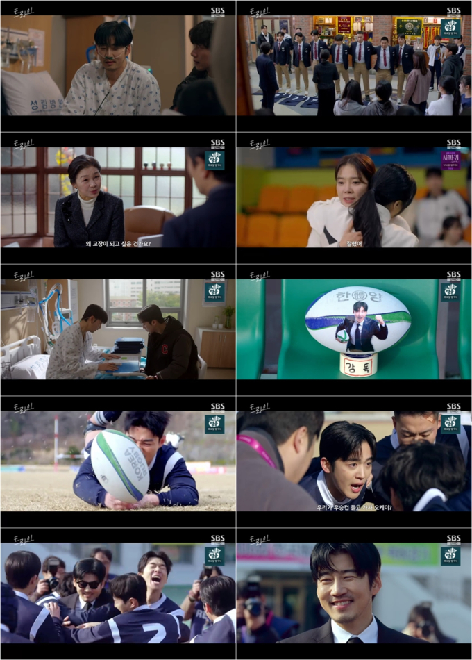 ‘트라이’결승전등장최고7.3%(사진:SBS)‘트라이:우리는기적이된다’에서중증근무력증으로인해감독자리를비웠던윤계상이럭비부의전국체전결승전에등장해전율을선사했다.지난29일(금)방송된SBS금토드라마‘트라이:우리는기적이된다’(이하‘트라이’)11화는한양체고럭비부가15년만에전국체전결승전에진출하며치열했던성장서사의정점을찍어감동을안겼다.특히중증근무력증으로한양체고럭비부감독사퇴위기에놓였던주가람(윤계상분)이결승경기직전,경기장에직접등판하는모습이엔딩을장식해짜릿한전율과뭉클함을선사했다.이에‘트라이’는최고시청률7.3%,수도권6.2%로동시간대1위를차지하며,6주연속주간및금요드라마1위왕좌를수성하는기염을토했다.(닐슨코리아)이날방송은가람이자신의감독직사퇴를두고벌어진교무회의에서쓰러져응급실에실려가는모습으로시작돼긴장감을높였다.가람은전국체전을위해끝까지수술을미루고자했지만,가람의몸상태는이미심각한수준이었다.교감성종만(김민상분)과부교육감나규원(장혁진분),사격부감독전낙균(이성욱분)은이기회에가람을사퇴시키기위해움직였다.가람은자신없이전국체전을뛰어야한다는사실에걱정하는럭비부에게“감독은지켜보는거야,선수들이해내는거고.지금부터는7명의마음을딱모아서한팀이되는거야.팀보다위대한감독은없어”라며믿음을줬다.특히가람은주장으로서의부담감을털어놓는성준을향해“네가3년간매일해왔던노력들은그대로쌓여있어.그시간들을믿어봐.그게안되면팀을믿고.근데나는윤성준을믿으려고”라는진심어린조언을건네감동을선사했다.교감종만이성준에게가람을대체할새감독을고르라고압박을가했지만,성준과럭비부는“어차피마지막경기일거라면감독님이랑같이뛰고싶다”라며전국체전보이콧이라는최후의보루를택했다.교장강정효(길해연분)는종만이더는럭비부를건드리지않게하기위해,불명예사퇴로종만에게교장직을넘기는방법을택했다.정효는“성적보다성장을할수있는체고를만들고싶었다.그걸위해내몫을기꺼이내놓는것”이라며종만에게일침을가하는참된교장의모습으로뭉클함을전했다.정효의도움으로럭비부는가람을감독으로남겨둔채전국체전을나갈수있게됐다.사격부의전국체전대표선발전에서서우진(박정연분)이1위를차지해통쾌함을선사했다.사격부플레잉코치배이지(임세미분)의도움으로우진이부상을극복하고재활에성공한것.이지는선수를메달기계취급하는낙균에게“선수는경기를포기하지않고,지도자는선수를포기하지않는다”라고일갈하며진정한코치와선수의가치를일깨워통쾌한한방을날렸다.사격부나설현(성지영분)은아빠규원의승부조작행위를알게되자,자신의패배를인정하고우진에게축하와함께화해의손을건네는올곧은스포츠맨십을보여진한울림을전했다.가람은투병중에도성준과함께전술을분석하며최선을다해전국체전을준비했다.특히전국체전출정식에서공개된응원영상에서럭비부선배로가람이등장했다.가람은럭비부원의이름을하나하나부르며“우리는16팀중에가장최선을다했어.많이넘어져본사람만이다시일어서는법을배운다는걸너희는이미알고있어”라며마지막응원을더했고,이어“우리결승전에서꼭만나자”라는약속을전해눈시울을적셨다.럭비부는가람의진심어린응원에결승을향한굳은결의를다졌다.이어전국체전에서혼신의힘을다하는한양체고럭비부의치열한경기모습들과,수술을받는가람의모습이교차돼가슴을먹먹하게했다.럭비부는가람의사진이붙은럭비공과함께하며그어느때보다굳건한팀워크를발휘했고,마침내15년만에결승에진출하는짜릿한쾌거를이뤄냈다.결승전당일가람을기다리는럭비부에게가람이보낸전술노트만배달됐다.결국럭비부는가람없이결승전필드를밟았다.경기시작직전,뜨거운환호와함께가람이당당히경기장으로입성해짜릿한전율을안겼다.화려하게등장한가람은자신을보자마자눈물을글썽이는럭비부를향해“내가결승에서만나자고했잖아”라며환한미소를지어보는이들의마음까지벅차오르게했다.이어진에필로그에서는가람이한양체고전술집에남긴럭비부원한명한명을위한메시지와‘우리는기적이된다’라는문구를바라보는모습이담겼고,진정한감독으로거듭난가람의뜨거운진심이시청자들을울컥하게했다.이제단한화만을남겨둔‘트라이’의한양체고럭비부는돌아온가람과함께‘전국체전우승’이라는기적의승부를이뤄낼수있을지,마지막까지심장을두근거리게하는한양체고청춘들의가슴짜릿한서사에대한궁금증이최고조로치솟는다.이에'트라이'11화방송직후각종온라인커뮤니티및SNS에서는“나지금주가람모드임내새끼들안아주고싶어”,“보는내내벅차오른다”,“만화같은전개너무좋다”,“더보고싶다럭비부”,“대사들이하나같이가슴에쌓이네”,“윤계상연기너무잘한다”,“울고웃고응원하고오늘다함”,“럭비부우승하자!한양우!”등뜨거운반응이이어졌다.SBS금토드라마‘트라이’는예측불허괴짜감독주가람과만년꼴찌한양체고럭비부가전국체전우승을향해질주하는코믹성장스포츠드라마로오늘(30일)밤9시50분최종화가방송된다.박지혜기