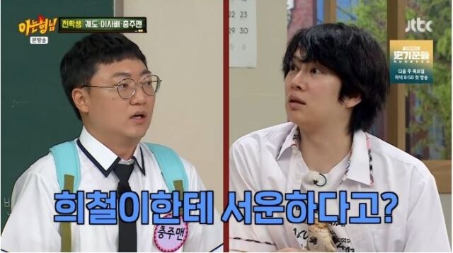 공무원유튜버충주맨(왼쪽)이김희철과의술자리에참석해실망한사연을공개했다./JTBC'아는형님'[마이데일리=서기찬기자]공무원유튜버충주맨이김희철에게실망해'손절'한사연을이야기했다.지난30일방송된JTBC예능'아는형님'에과학유튜버궤도,공무원충주맨,뷰티크리에이터이사배가출연했다.이날충주맨은"김희철에게서운한점이있다"며뜻밖의폭로를해시청자들의눈길을끌었다.충주맨은과거김희철과함께방송을하면서김희철이자신을매우좋아해연락처를주고받았다고말했다.당시를회상하며"믿을수없었다.대스타가날부르다니"라고표현하며김희철에게술자리초대를받았다고밝혔다.'아는형님'충주맨과김희철./JTBC'아는형님''아는형님'궤도(왼쪽)와충주맨./JTBC'아는형님'이어충주맨은"스타들의술자리는어떨까궁금해서..."라고덧붙였다.그리고김희철의전화를받자마자휴가내고서울까지한달음에올라왔다는충주맨은화려한연예인들의술자리를상상했지만,막상도착한곳은'실내포차'였다고털어놨다.충주맨은"연예인들술자리라고해서꼭대기층에서와인이나,불타는샴페인을마실줄알았다.막상가보니까실내포차같은곳에서찌개랑소주를마셨다"고말해현장을폭소케했다.이어"심지어술자리멤버도궤도,박정석형이더라"라고덧붙였다.결국충주맨은기대와다른현실에"너무실망해서그다음부터연락을안받았다"고고백했고,김희철은"어쩐지답장을안하더라"라며뒤늦게상황을파악해웃음을더했다.Copyright©마이데일리.무단전재및재배포금지.