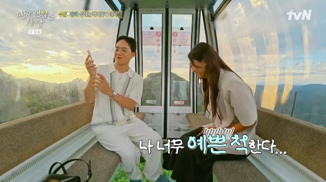 [OSEN=박하영기자]‘진짜괜찮은사람’허영지친구신동하가김영광친구강수진에게적극적으로다가갔다.31일방송된tvN예능‘진짜괜찮은사람’에서는강수진과신동하가1:1데이트후가까워진모습이그려졌다.이날강수진과신동하는케이블카를타고하늘에서달달한둘만의시간을보냈다.커플사진은물론,서로를찍어주기도했고강수진은“나너무예쁜척한다.오그라들어”라고말했다.이에신동하는“예쁘잖아”라며자연스레칭찬했다.절친허영지는신동하의멘트에“진짜적극적이네”라고놀랐고,신동하는“사실난오늘하루가되게완벽했다”라며만족감을드러냈다.이를본미주는“다혜랑데이트했을때동하씨가뭐라고했더라.소득이없다고했는데”라며씁쓸해했다.김영광은절친강수진에대해“제가봤을때모솔이라서그런경험을못해봤는데동하씨주옥같은멘트랑배경에완전푹빠졌다”라고분석했다.1:1데이트후가까워진두사람에김남희친구오현진은“그둘의분위기를봤을때뭔가가있다.나와는다른분위기가있다고느껴져서나보다훨씬더저둘이잘어울리고둘이잘맞는구나생각했다”라며털어놔안타까움을자아냈다./mint1023/@osen.co.kr[사진]‘진짜괜찮은사람’방송화면캡처Copyright©OSEN.무단전재및재배포금지.