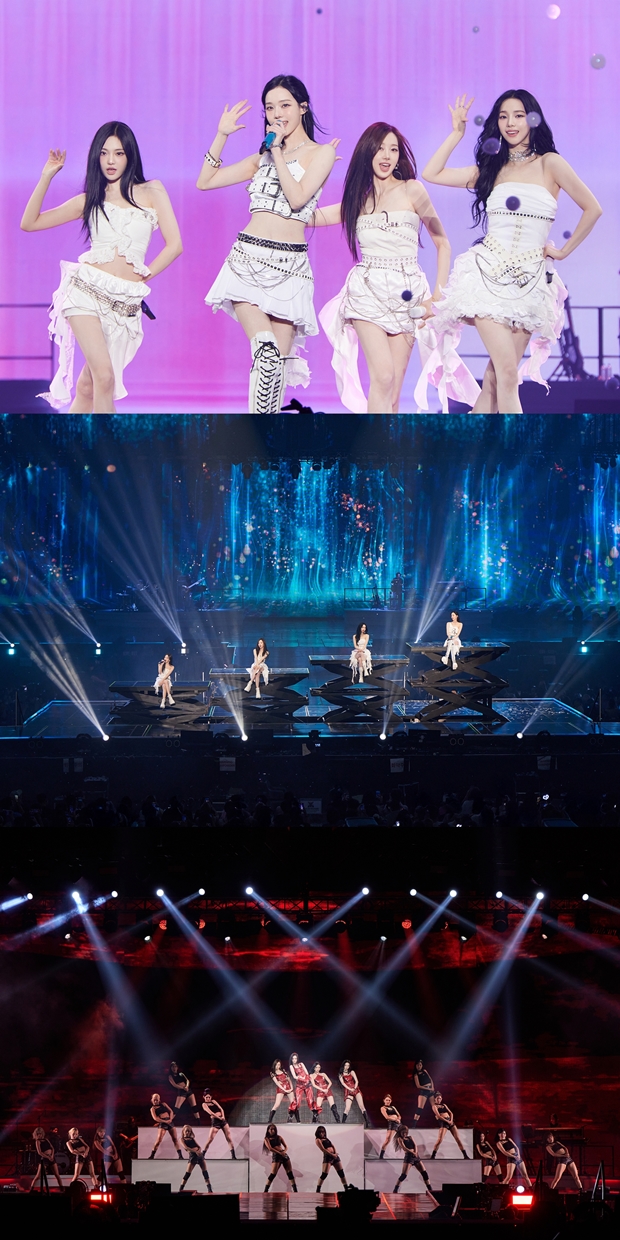 티브이데일리포토[티브이데일리김진석기자]그룹에스파의세번째단독콘서트'엑시스라인'이막을내렸다.31일오후서울시송파구올림픽공원KSPODOME에서에스파의세번째단독콘서트'2025에스파라이브투어–싱크:엑시스라인(2025aespaLIVETOUR-SYNK:aeXISLINE)'이화려한막을올렸다.지난29일부터31일까지열린이번콘서트는치열한티켓경쟁으로3회공연모두시야제한석까지전석매진됐다.현장을방문하지못하는팬들을위해서는지난30일과오늘(31일)공연은BeyondLIVE등을통해온라인생중계로도중계됐다.이번콘서트는'중심축'을의미하는'AxisLine'에서착안한타이틀로,항상주체적인메시지로긍정적에너지를선사하는에스파의행보를보여줌과동시에,같은뜻을지닌이들과함께하는'연대의시작'을콘셉트로한공연이다.공연은시야제한석까지전석매진되며약3만명의관객과함께했다.무대는'중심축'을드러내는커브드LED와업&다운이가능한센터LED,대형세트전환을위한오픈-클로즈형BackLED등으로다수의영상활용해몰입도를높였다.이날에스파는큰천과함께등장하며'아마겟돈(Armageddon)'으로포문을열었다.특히곡의분위기를더욱고조시키는레이저프로젝션이이목을끌었다.이들은'셋더톤(SetTheTone)'과미니6집수록곡'드리프드(Drift)'를선보이며관중들의열기를끌어올렸다.마이들을만난카리나는"오늘이렇게서울마지막공연을꽉채워주셔서감사하다.마지막공연인만큼혼을불살라서무대할테니,여러분도잘즐겨주셨으면좋겠다"라고당부했고,윈터는"마지막처럼즐길자신있냐.앞으로의무대들도기대해주시길바라겠다.마지막처럼무대를할테니재밌고행복한시간보내길바란다.닝닝은"3일이후딱지나버린것같은데,마지막날까지다같이함께신나게놀아줬으면좋겠다.오늘도잘부탁드린다"라며콘서트마지막날임을언급했다.이에더해지젤과닝닝은해외에서라이브방송으로콘서트를지켜보고있는팬들을위해일본어와중국어로인사를전하기도했다.이후지난6월공개된싱글'더티워크(DirtyWork)'를펼친뒤,멤버들의솔로무대가펼쳐졌다.카리나의'굿스터프(GOODSTUFF)',닝닝의'케첩엔레모네이드(KetchupAndLemonade)',지젤의'토네이도(Tornado)',윈터의'블루(BLUE)'가연달아이어져환호를자아냈다.솔로무대에이어완전체로다시모인에스파는'도깨비불(Illusion)''트릭오어트릭(TrickorTrick)'을펼치며환호를이끌어냈고,멤버들은각자의솔로곡을설명하며분위기를이어나갔다.이어'플라워스(Flowers)''자각몽(LucidDream)''떨스티(Thirsty)'와미니6집수록곡'엔젤(Angel)#48'에이어,'베러띵스(BetterThings)''스파이시(Spicy)'를연달아선보였다.'자각몽'무대에선무대중앙을잇는통로에여러천을설치해신비로운느낌을자아냈다.에스파는여섯번째미니앨범의타이틀곡'리치맨'을선공개한뒤,'킬잇(KillIt)'과'다크아츠(DarkArts)'를이어펼치며관객들에게많은환호를얻었다.'리치맨'은무대뒤수많은돈다발이펼쳐져시선을사로잡았고,'리치맨'의콘셉트에스파의콘셉트와이미지와착맞아떨어져관중들의환호를이끌어냈다.이후윈터는"여러분이좋아하는곡으로몰아놓은섹션이었다.좀기다리고있는게있지않냐.저희의'리치맨'도선공개했다.어떤것같냐"라고물었고,마이들은환호로화답했다.카리나는마이들에게"오늘응원법영상을찍고왔다.지금비상이다.엇박이란걸넣어봤다.근데할수있을정도의엇박이다.기대많이하고있다"라며마이들과케미를자랑했다.에스파는'넥스트레벨(NextLevel)''수퍼노바(Supernova)''위플래시(Whiplash)''걸스'와'드라마'(Girls+Drama)를함께선보여타이틀곡메들리를이어갔다.'넥스트레벨'과'위플래시'에선밴드세션의변주가눈에띄었고,'걸스'와'드라마'또한댄스브레이크카메라워크와신선한연출을선보였다.이후에도KSPODOME의열기는가라앉지않았고,토롯코를타고등장한다시에스파는앙코르무대로'포에버(Forever,약속)'와'리브마이라이프(LiveMyLife)'를펼치며관중석을누볐고,마이와의영원을약속했다.마지막으로지젤은"콘서트를3일동안한건처음인것같다.라며눈물을보였다.이번콘서트를만드는데시간도적어서더열심히만들었다.도움을주신모든분들에게감사하다.좋아해줬으면좋겠다.너무고맙다"라며눈물을보였고,윈터는"이번콘서트가단기간에준비를해야했기에,모든분들이부담을갖고있었다.다들좋아해주는모습을보니까저희도너무행복하고기억에남는그런콘서트가될것같다"라고전했다.카리나는"토롯코타면서봤는데,저희도즐거웠다.저희에게좋은의미가되어주셔서감사하다.고생하신스태프분들이많으셔서,이번콘서트를준비하면서마이를포함해내가고생했나싶은분들너무감사하다.앞으로도더감사할줄알고,멋진아티스트가되겠다"라고말했고,닝닝은"3일을하니까더하고싶어지고긴장도풀리는데,아쉽게끝내게됐다.이번엔정말고생을했고우리마이도그렇고시간도많이없었는데다같이고생해주신직원분들에게감사하다"라고소회를드러냈다.이렇게에스파는세번째앙코르곡이자새앨범의마지막트랙인'투더걸스(ToTheGirls)'를마지막으로콘서트를마무리했다.더불어이날첫공개한에스파의응원봉이름은옙봉이었다.에스파의이번세번째투어는서울을시작으로,10월4~5일후쿠오카,11~12일도쿄,18~19일아이치,11월8~9일도쿄,15~16일방콕임팩트아레나,26~27일오사