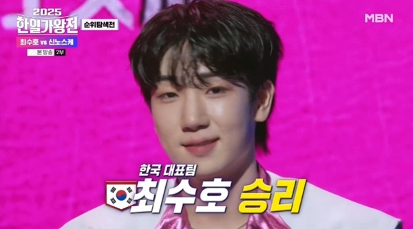 '2025한일가왕전'2일방송MBN'2025한일가왕전'캡처(서울=뉴스1)박하나기자=가수최수호가'2025한일가왕전'막내대결에서승리를거뒀다.6일오후방송된MBN예능프로그램'2025한일가왕전'에서는한국과일본을대표하는남자현역가수들의맞대결이담겼다.본선1차전에승점1점을확보할수있는예선전이시작된가운데,예선전은같은한일양국의같은순위끼리맞붙는순위탐색전으로대결을펼쳤다.각무대의결과는양국의국민판정단100명의투표로결정된다.각팀의6위이자막내인최수호와키모토신노스케의대결이성사됐다.유일한현역0년차키모토신노스케는일본의국민가수사이조히데키의아들이라고알려져시선을모았다.선공에나선한국의막내최수호는구창모의'방황'을선곡,현란한퍼포먼스와탄탄한가창력으로환호를자아냈다.이어키모토신노스케는체커스의'눈물의리퀘스트'를선곡,수준급드럼실력까지뽐내대결의재미를더했다.대결결과최수호가72점을획득하며승리를거뒀다.한편MBN'2025한일가왕전'은한국과일본의트롯국가대표Top7이펼치는한일음악국가대항전으로매주화요일오후9시50분에방송된다.MBN'2025한일가왕전'캡처[email protected]©뉴스1.Allrightsreserved.무단전재및재배포,AI학습이용금지.