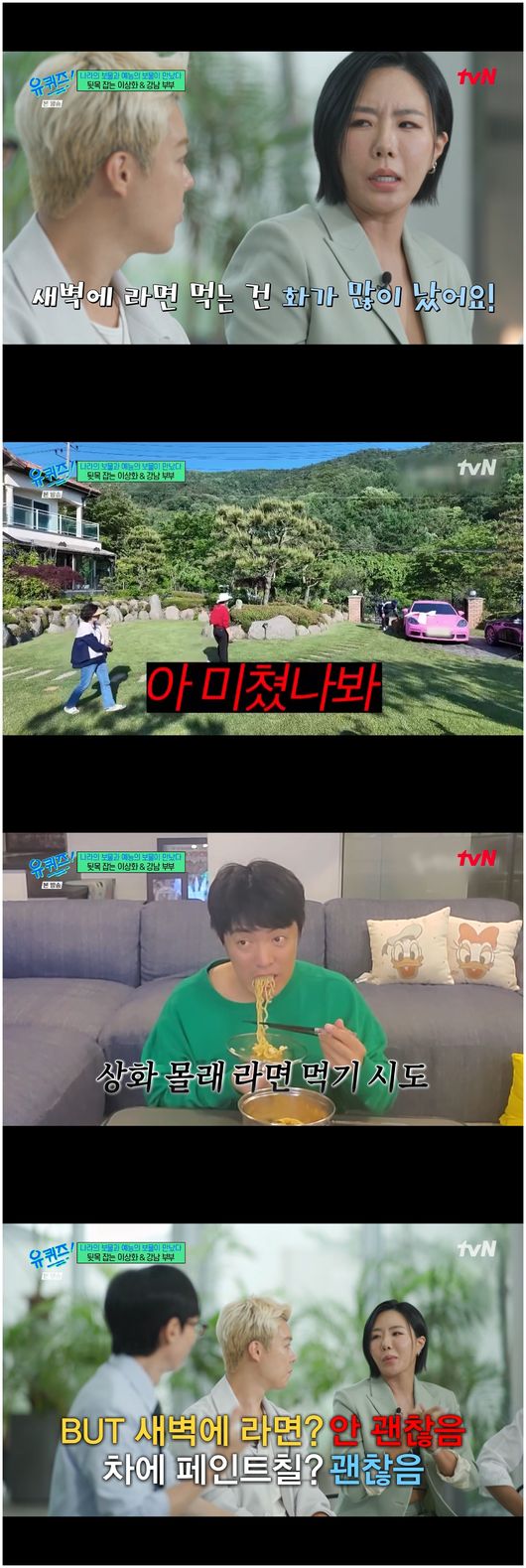 [OSEN=오세진기자]‘유퀴즈온더블럭’전국가대표스피드스케이팅이상화가남편강남에대한기행중용납할수없는부분을밝혔다.3일방영된tvN‘유퀴즈온더블럭’(이하‘유퀴즈’)에서는이상화,강남부부가등장했다.강남은유튜브채널을통해장난기넘치는모습을보여많은구독자의웃음을유발했으나,이상화를향한도발아닌도발로모두를기겁하게했다.특히이상화의애마로알려진고급외제차를핑크색으로칠해이상화를기겁하게했고,또한이상화몰래새벽에라면을먹다가걸려서무시무시한목소리를방송에내보내모두를놀라게했다.이상화는“차에페인트칠하는건괜찮은데밤에라면먹는건안된다.부기도그렇고,살이나건강에문제가된다”라며정색했다.강남은“상화씨가살찌는걸정말싫어한다”라고말했고,이상화는“술마시는건괜찮지만,술에취해서헤롱대는건싫다”라며또한싫어하는것에대해말했다.강남은“아무리술에취해도이상화목소리를들으면무조건깬다.그래서무서워서동네3바퀴정도돌고들어간다”라고말해찰떡같이잘맞는부부라는걸설명했다./[email protected][사진채널]tvN채널‘유퀴즈온더블럭’방송화면캡처Copyright©OSEN.무단전재및재배포금지.