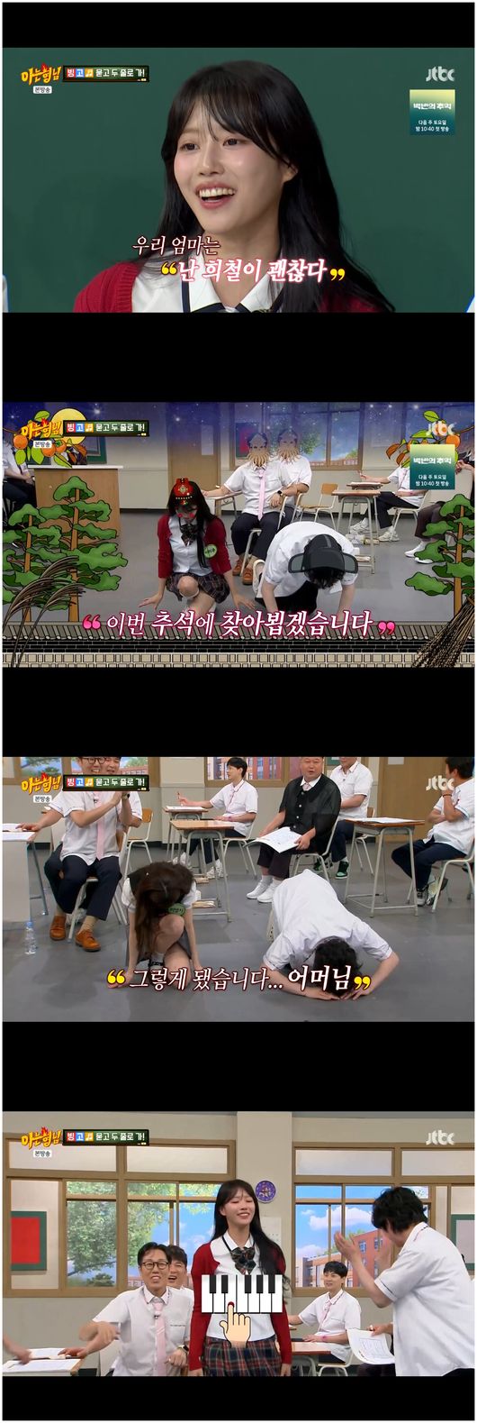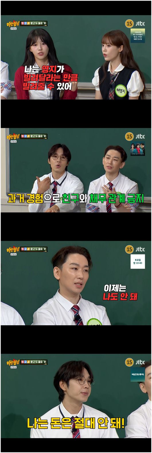[OSEN=오세진기자]‘아는형님’이미주가절친허영지와김희철을둘러싸고삼각관계에빠졌다.6일방영한JTBC예능‘아는형님’에서는이미주,허영지,이석훈,김호영등이등장했다.이들은절친특집으로연예계에서도잘알려진절친들이었다.이미주와허영지는서장훈과함께10여년전한프로그램에나왔다가만나게됐다.그러나둘은첫만남을서로달리기억하고있었다.허영지는“그때미주가오더니‘선배님,너무팬이고같이해서너무좋아요.사진한번찍으면안돼요?’라고하더니이젠기어오른다”라며장난스럽게말했다.이미주는“친구더러기어오른단다”라며코웃음을쳤다.허영지는“너나더러계속선배님,선배님계속이랬다”라고말했고,이미주는“나는‘선배님,선배님’안되는애다.너자꾸미친소리할래”라는격렬한반응에이수근등은"너희절친인거더설명안해도알겠어"라며웃음을지었다.이들은뿐만아니라레벨슬기,오마이걸효정,지예은까지친한무리였다.이미주는“우리는94년생동갑이다.오마이걸효정이,레드벨벳슬기,그리고지예은까지친구다”라며“우리들이친해진건기억이안나는데94즈가만들어진것만기억이난다”라고말했다.이에대해이미주는“슬기,영지,효정이다따로알아서한번연락을해서모여서놀자고했다”라며설명했는데허영지는“그때이미주가‘야,다따로만나는거귀찮은데그냥다같이만나면안되냐?’라고했다.너왜자꾸방송이라고왜곡을해?”라며반박했다.모임회비에대한내용도나왔다.허영지는“원래만날때마다누가한명이계속결제를하려고하더라.그러면오래만날수없을거같아서더치페이를하자고했다”라고말했고,이미주는“무슨소리야”라며말도안된다고말했다.이미주는“내가술을마시면지갑이열리는스타일이다.94즈처음만났을때내가술을마시고신이나서내가산다고했다.애들이사케를시켰다.그런데효정이랑슬기가착해서절반은자기들이산다고했다.술값은100만원이나왔다”라면서“그런데허영지가‘왜반을내?이미주가다낸다고했는데’라고하더라”라고말해웃음을자아냈다.한편김희철을둘러싼이미주와허영지의대결이펼쳐져웃음을안겼다.서장훈은“미주는희철이어떠냐”라고물었고,이미주는“너무좋다.진행도잘하고,너무잘챙겨주신다”라고답해설레는분위기를자아냈다.김희철은“‘이십쎄기힛트-송’에서우리둘이핑크빛기사가많이나지않았냐.어머니는뭐라고하시냐”라며질문에박차를가했는데,이미주는“이거또기사날거같다.우리엄마는‘난희철이괜찮다’라고하셨다”라고말하더니김희철과나란히큰절을올렸다.이에허영지는같이술을마시고싶은멤버로김희철을꼽더니핑크빛분위기를자아냈다.그러자이미주는허영지를밀치며"비켜,xx"라고말하며웃음을안겼다./[email protected][사진출처]JTBC예능‘아는형님’Copyright©OSEN.무단전재및재배포금지.
