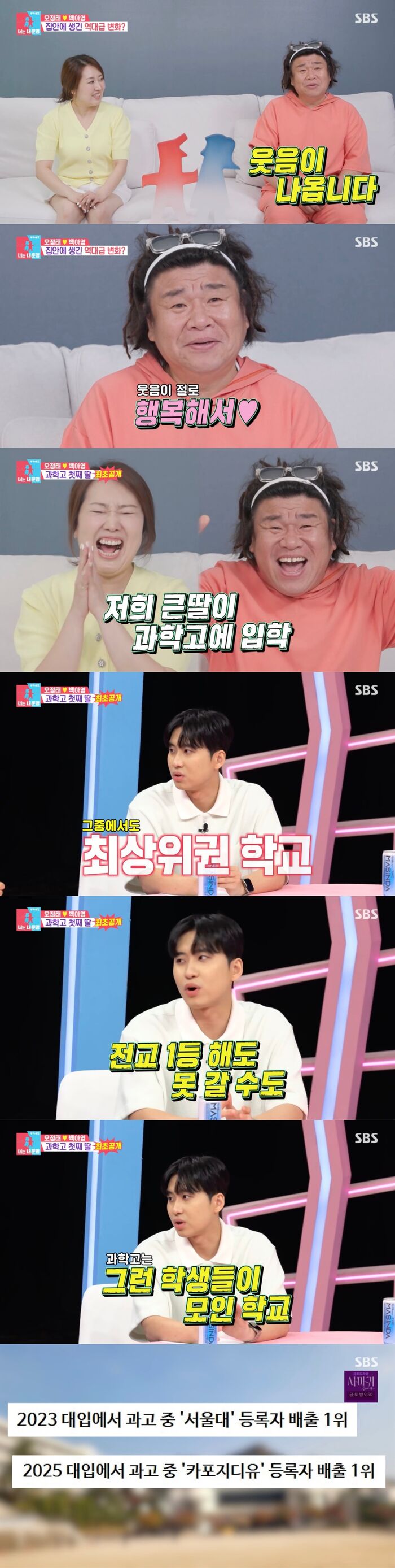 [SBS연예뉴스|김효정에디터]오정태백아영부부가기쁜소식을전했다.8일방송된SBS'동상이몽시즌2-너는내운명'(이하'동상이몽2')에서는지난해시청률1위의주인공오정태백아영커플이다시등장했다.이날방송에서패널들은오정태가미미미누와함께출연한것에대해의아함을드러냈다.이에오정태는"오늘아마패널분들이부러워서배가너무아플거다.우리부부의기적같은일궁금하시죠?함께보시죠,박수와함성이요"라고말했다.이어오정태는백아영과함께"저희큰딸이과학고에입학했다"라며기쁜소식을전해눈길을끌었다.특히미미미누는오정태큰딸이합격한과학고에대해"공부를그냥잘한수준이아닌데?과학고가전국에20여개있는데그중에서도최상위권인학교다.중학교에서전교1등을해도못갈수있다.보통초딩때중등수학과학다끝내고중딩때고등수학과학을다끝내야한다.그런학생들이모인학교다"라고말해모두를놀라게했다.그리고해당학교는서울대,카포지디유배출1위과학고라며"카포지디유는카이스트포스텍지스트디지스트유니스트이공계특성화대학교합친말이다"라고설명해관심을모았다.Copyright©CopyrightⓒSBS.Allrightsreserved.무단전재,재배포및AI학습이용금지