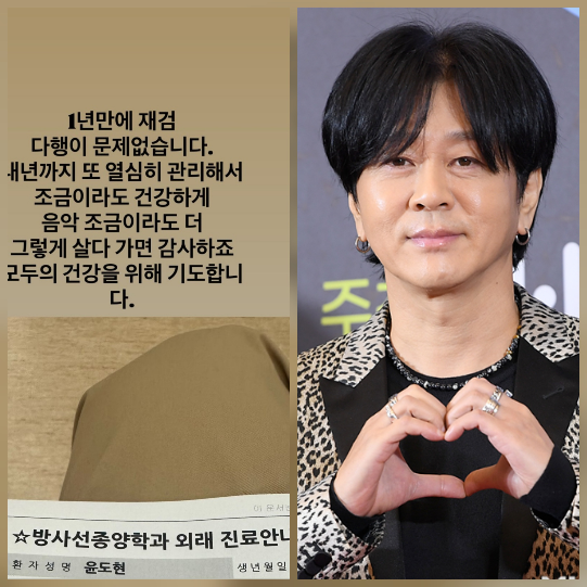 그룹YB보컬윤도현(53)이희귀암완치판정1년만의재검에서도이상이없음을알리며안도감을전했다.이어“인생은길지않다”는메시지를남겨팬들의마음을울렸다.윤도현은병원대기실에서촬영한사진을올리며차분한글을남겼다.갈색바지차림의무릎위에놓인진료안내서가카메라에담겼고,검진을마친후의안도감이고스란히전해졌다.윤도현은8일SNS를통해“1년만에재검,다행히문제없습니다.내년까지또열심히관리해서조금이라도건강하게,음악조금이라도더하며살다가면감사하다”며감사의마음을드러냈다.윤도현이희귀암완치판정1년만의재검에서도이상이없음을알리며안도감을전했다.사진=윤도현SNS,천정환기자이어“인생은길지않다는걸점점느낀다.그러니하고싶은일을해보고,때로는일탈도하고과감한도전도해보는게좋다”고덧붙였다.그는“망가지기도하고후회도하고다시일어서고다잡고깨닫고반성하며울고웃는것,그것이인생의모습”이라며“우리는누구도완벽할수없지만조금이라도나아지려는노력을할뿐”이라고전해울림을더했다.윤도현은지난2021년희귀암판정을받고3년간투병생활을이어왔다.당시대중은물론부모에게도사실을알리지않은채라디오DJ와공연을병행하며활동을이어가놀라움을안겼다.2023년완치판정을받은그는이후에도꾸준히음악활동을이어왔다.재검소식을접한팬들은“정말다행이다”,“건강한모습오래보고싶다”,“가사보다더울컥한글”이라며안도의반응을보였다.또“인생메시지가위로된다”,“윤도현답다”는댓글이이어지며공감을자아냈다.윤도현은1994년솔로가수로데뷔한뒤밴드YB로활동하며‘나는나비’,‘사랑했나봐’,‘박하사탕’등수많은히트곡을발표했다.록음악대중화에기여하며세대를아우르는보컬리스트로자리매김했다.한편윤도현은앞으로도공연과방송을통해팬들과꾸준히만날계획이다.[김승혜MK스포츠기자][ⓒMK스포츠,무단전재및재배포금지]Copyright©MK스포츠.무단전재및재배포금지.