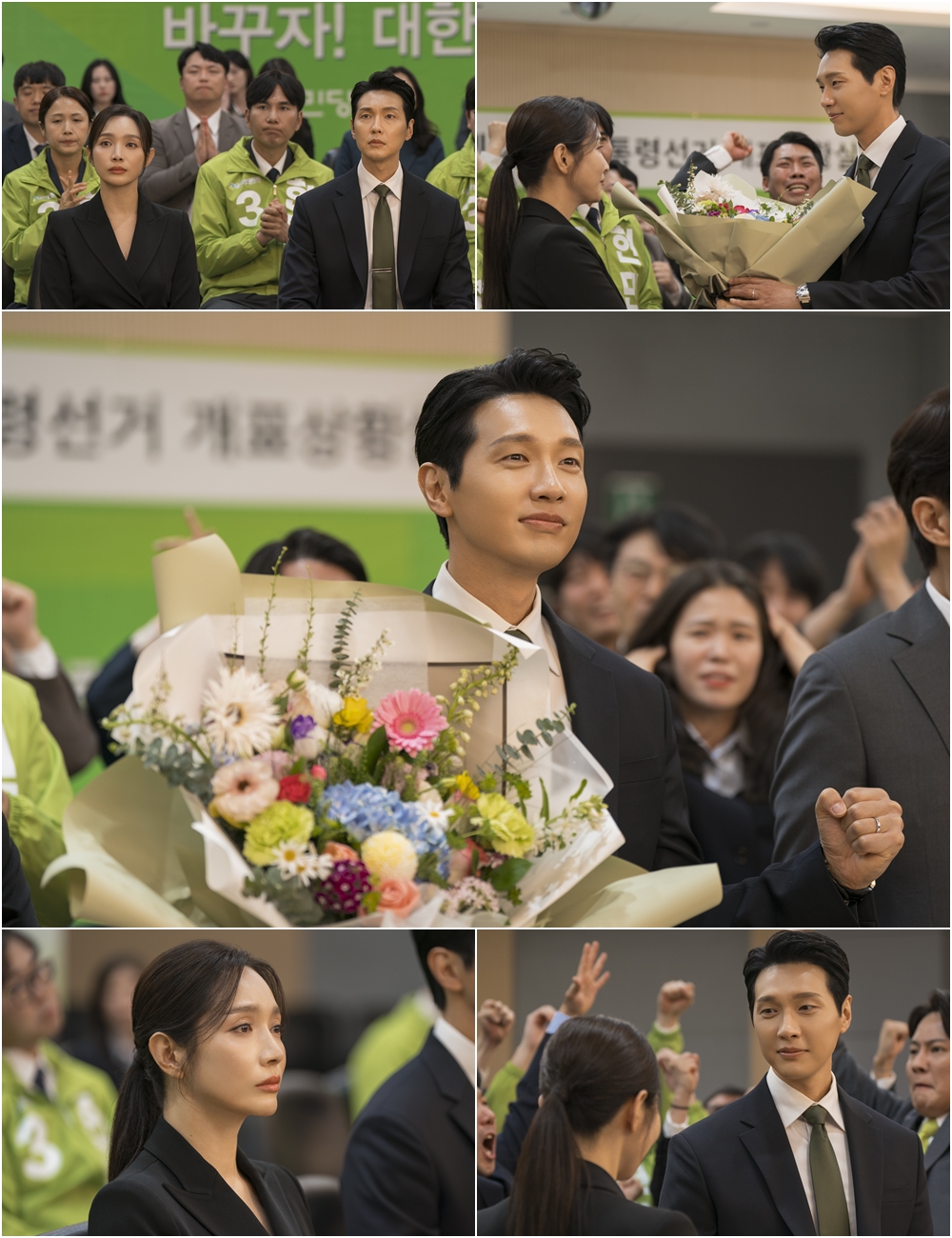 ‘퍼스트레이디’지현우-이민영이감격스런‘극적대통령당선’현장을선보였다.iMBC연예뉴스사진오는9월24일(수)밤10시20분첫방송을앞둔MBN새수목미니시리즈‘퍼스트레이디’(극본김형완,연출이호현,제작㈜스튜디오지담,㈜아티스트스튜디오,㈜로드쇼플러스)는대통령에당선된남편이장차퍼스트레이디가될아내에게이혼을요구하는초유의사건이벌어지면서펼쳐지는이야기를담는다.대통령취임까지남은67일동안대통령당선인부부의숨막히는갈등속에불거지는정치권의음모와가족의비밀을속도감있게그린다.‘퍼스트레이디’는드라마‘드림하이2’,‘신분을숨겨라’와영화‘슈퍼스타감사용’등을통해탁월한쫄깃함의서사와치밀한캐릭터구성으로각광받은김형완작가가무려6년간의집필로완성된야심작이다.특히유진-지현우-이민영-한수아-신소율-김기방-오승은등스펙트럼넓은연기력과폭발적인에너지를지닌배우들이의기투합해환상의시너지를터트린다.‘퍼스트레이디’에서지현우는고아원에서자란공장노동자출신으로국회의원후보를거쳐마침내대통령에당선된현민철역을맡았다.이민영은대통령당선인현민철(지현우분)의선대위수석이자최측근인신해린역으로분해‘당선인과비서’의남다른‘정치적케미’를선사한다.이와관련지현우와이민영이초조에서긴장,환희로이어지는‘대통령당선순간’의롤러코스터감정선이포착됐다.극중현민철과신해린이참여국민당개표상황실에서대통령선거개표상황을지켜보는장면.현민철은담담한표정으로개표방송을지켜보는반면,신해린은초조한듯두손을모은채긴장감으로얼어붙어있다.이내당선이확정되면서현장은환호로뒤덮이고현민철은당당한미소를띠며신해린이전한꽃다발을건네받는다.주먹을불끈쥔채위엄있는자태를취한현민철과묵묵하게곁을지키며벅찬감격을눈빛으로증명한신해린이앞으로어떤정치적행보를보여줄지궁금증이모인다.그런가하면지현우와이민영은‘개표상황실속대통령당선확정’장면에서순식간에변화하는감정선을디테일한연기로표현하며이목을집중시켰다.지현우는현민철이대통령에결정되는역사적인순간,승리확정전까지오르내리는감정의변화를차분하게그려내사실감을더했다.이민영은긴장으로굳어있는표정에서급변해당선순간기쁨의희열을터트리는신해린의감정진폭을생생하게구현했다.두사람의대비되는표정과시선이자연스럽게교차하면서서사적인무게감이한층강조된장면이완성됐다.제작진측은“지현우와이민영은이장면에서단순한기쁨의순간이아닌정치적최전선에서피어난동지애를극적으로표현했다”라며“권력을거머쥐게된대통령당선인지현우와최측근비서이민영이앞으로어떤균열과파국을맞게될지지켜봐달라”라고밝혔다.한편,MBN새수목미니시리즈‘퍼스트레이디’는다양한작품성있는드라마제작으로‘K-콘텐츠명가’로자리잡은제작사㈜스튜디오지담과배우이정재가대주주로있는㈜아티스트스튜디오,그리고㈜로드쇼플러스가뭉쳐드라마장르물의새지평을열것으로기대를모은다.오는9월24일(수)에첫방송된다.iMBC연예유정민|사진출처MBN‘퍼스트레이디’Copyright©MBC연예.무단전재및재배포,AI학습금지.