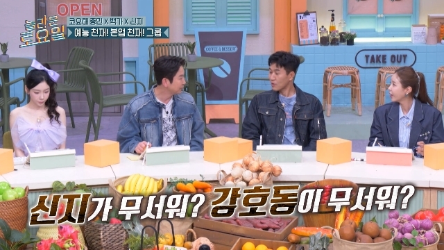 tvN‘놀라운토요일’캡처tvN‘놀라운토요일’캡처[뉴스엔서유나기자]코요태김종민이신지와강호동중더무서운사람을꼽았다.9월13일방송된tvN예능'놀라운토요일'(이하'놀토')383회에서는도레미들이코요태김종민,신지,빽가와함께받쓰(받아쓰기)에도전했다.이날빽가는'놀토'일곱번째출연이라며코요태멤버들에게텃세를부리고싶은속내를고백했다.하지만정작어떤텃세를부릴지는생각못했다면서"그때그때텃세를부리고싶은데뭐를부려야할지모르겠고솔직히말해서신지랑떨어져앉을줄알았는데신지옆에앉으니까취소하겠다.텃세안부리고열심히하겠다"며성실한태도를보여줬다.김종민은"무섭죠,신지가"라며공감했다."예전에신지한테혼났던사람들은나이가먹어도무서워한다"고.하지만김종민은신동엽이"신지가무서워,강호동이무서워?"라고묻자"그래도호동이형이죠"라고당연하다는듯답해웃음을자아냈다.신지는"제가그정도는아니다"라고덧붙였다.뉴스엔서유나stranger77@기사제보및보도자료[email protected]ⓒ뉴스엔.무단전재&재배포금지Copyright©뉴스엔.무단전재및재배포금지.