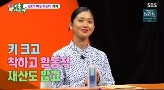 오마이걸미미./sbs'미운우리새끼'[마이데일리=서기찬기자]'미운우리새끼'에출연한오마이걸미미가이상형으로서장훈을지목하며재치있는청혼을건넸다.14일방송된SBS예능'미운우리새끼'에는스페셜MC로오마이걸미미가함께했다.이날미미는자신의이상형을묻는질문에"키크고착하고활동적이며재산도많고,배울점도많은사람"이라면서"입냄새나지않는남자"라고구체적으로답해웃음을자아냈다.오마이걸미미./sbs'미운우리새끼'미미는앞서"제대로된연애를한번도못해본모태솔로"라고고백한바있다.미미는"초등학교2학년때와고등학교1학년때,총두번의연애경험이있다"고밝히며,"고등학교때는50일만에남자친구가바람을피워헤어졌고,초등학교때는쥐도새도모르게전학을가버렸다"고아픈연애사를털어놨다.이에신동엽은미미의이상형에대해"심상치않다"고언급하며,"여기부합하는사람이있다"고말하며서장훈을가리켰다.미미는놀라워하며"오!"라고감탄했고,"우쥬메리미?"라고깜짝청혼(?)을해모두를폭소케했다.Copyright©마이데일리.무단전재및재배포금지.