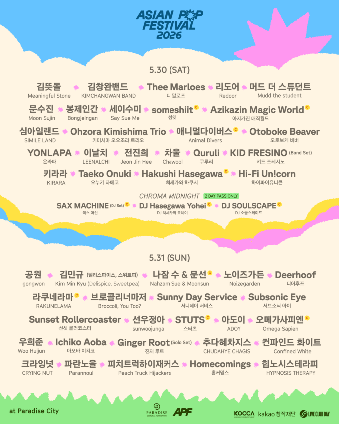 서울·도쿄·타이베이·자카르타의사운드가한무대로모인다.파라다이스시티가‘아시안팝페스티벌2026(아팝페)’을개최하며영종도가아시아음악교류의접점으로떠오르고있다.문화예술을향한파라다이스의진심이국경과세대를넘는‘음악적조우’의장을마련하고있는것이다.파라다이스문화재단은15일아팝페2026최종라인업을확정발표했다.최종라인업에는김민규(델리스파이스,스위트피),DJ소울스케이프,선우정아등이추가되며관심을증폭시킨다.앞서지난2월1~2차라인업으로공개된김창완밴드와오누키타에코(TaekoOnuki),노이즈가든등이밴드사운드와시티팝을대표하는아티스트였다면,이번에공개된최종라인업에는서정적인장르와함께전자음악과힙합을추구하는아티스트들이대거포함돼관심을모은다.먼저한국모던록의아이콘이자인디신의송가‘챠우챠우’의주인공김민규(델리스파이스,스위트피)가올해아팝페라인업에새롭게이름을올려관객들의감성을자극한다.자우림,크라잉넛등과함께한국인디록씬의1세대에속하는델리스파이스에서김민규는기타리스트이자보컬로서대부분의곡들을작곡했다.특히불후의명곡‘고백’이담긴앨범‘Espresso’는2004년제1회한국대중음악상최우수록음반상을수상하며지금까지도사랑받고있다.김민규는현재원맨프로젝트밴드‘스위트피’로활발한음악활동을이어가고있다.일명‘서울사운드’의대표주자로꼽히는대한민국1세대힙합DJ소울스케이프도아팝페를찾는다.한국의소울,펑크,재즈의유산을현대힙합과일렉트로닉사운드로재해석하는독창적인아티스트로국내힙합의미학적확장을이끌었다는평가를받는아티스트다.그의데뷔앨범인‘180gbeats’는한국대중음악100대명반에오르며‘대한민국제1의DJ’,‘DJ들의DJ’로불리고있다.‘뮤지션들이사랑한뮤지션’선우정아도아팝페의감성을채운다.장르를넘나드는천재싱어송라이터선우정아는2014년한국대중음악상시상식에서‘올해의음악인’과‘최우수팝음반’부문에서수상하며음악성을인정받은실력파아티스트다.아팝페가펼쳐지는무대중프리미엄클럽‘크로마’의미드나잇무대를책임질DJ들도기대를모은다.장기하와얼굴들에서기타·프로듀싱을담당했던DJ하세가와요헤이(DJHasegawaYohei)는빈티지하면서도세련된믹스를들려줄것으로보인다.선셋롤러코스터의멤버하오팅황의솔로프로젝트인색스머신(SAXMACHINE)은색소폰과일렉트로닉한사운드를결합한DJ퍼포먼스를펼친다.얼터너티브케이팝그룹바밍타이거의멤버이자새로운솔로프로젝트로폭발적인퍼포먼스를보여주고있는머드더스튜던트도아팝페무대에오른다.록과펑크감성이섞인음악을추구하는머드더스튜던트는아팝페에서거칠면서도청중들의감성을건드리는특유의공연을보여줄전망이다.일본힙합계에서트렌드세터로통하는키드프레시노(KIDFRESINO)는재즈·소울기반의감각적인힙합무대를선사한다.이외에도부산지역을중심으로결성돼글로벌밴드로성장한세이수미가아팝페를찾아기대를모은다.특히세이수미의‘OldTown’은팝의거장으로불리는엘튼존이자신의라디오에서추천하면서전세계리스너들의관심을받았다.또K-밴드씬의루키하이파이유니콘,미국기반의베테랑급인디록밴드디어후프(Deerhoof)도울림있는무대를선사할예정이다.타이베이인디씬을대표하는선셋롤러코스터(SunsetRollercoaster)는로맨틱한신스팝사운드로관객들을사로잡는다.앞서아팝페는아시아대중음악사에발자취를남긴김창완밴드와오누키타에코(TaekoOnuki),1집발매30주년을맞은노이즈가든부터피치트럭하이재커스,우희준,라쿠네라마,추다혜차지스등신진주자들이어우러진폭넓은라인업으로주목을받은바있다.아팝페2026티켓은현재NOL티켓을통해구매할수있다.Copyright©bnt뉴스.무단전재,재배포및AI데이터활용금지