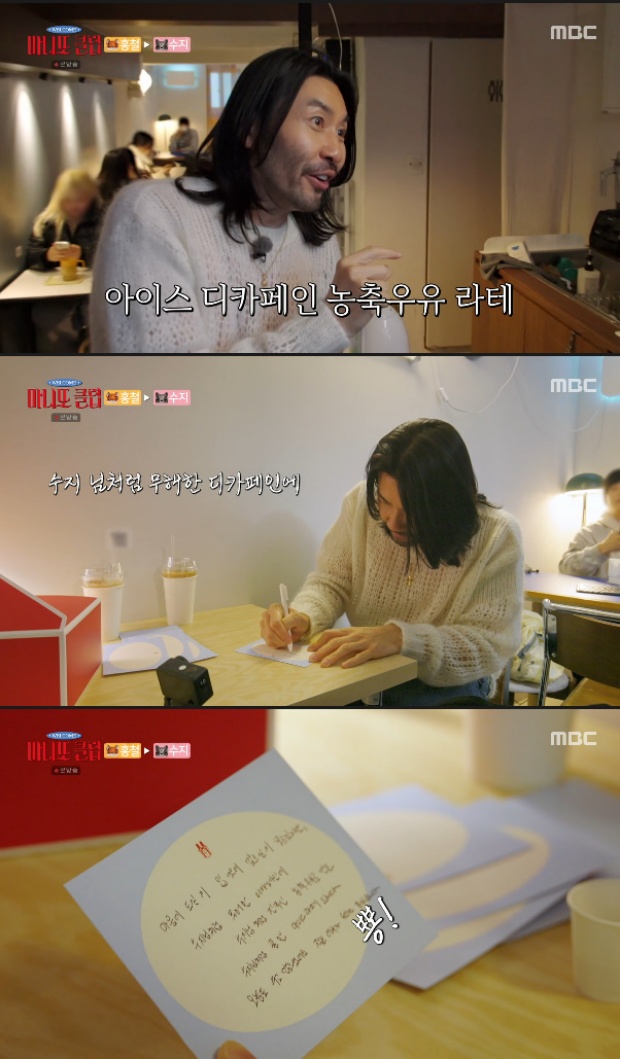 노홍철[티브이데일리한서율기자]'마니또클럽'에서방송인노홍철이코미디언이수지의선물을준비했다.8일저녁방송된MBC예능프로그램'마니또클럽'에서는이수지의단골카페를찾은노홍철의모습을그렸다.이날노홍철은이수지의커피배달을위해1시간거리의한카페로이동했다.그는이수지의취향을몰래확인한뒤"아이스디카페인카페라테에농축우유를넣어달라"라며맞춤커피를주문했다.노홍철은"커피만받고얼음을따로사서전달직전에넣어줘야겠다"라며섬세한계획을전했고손편지를작성해감동을더했다.그는"마음에드실지입맛에드실지모르겠다"면서"수지님처럼무해한디카페인에진국인농축우유로만든쿨한아이스라테다.오늘도수고많으셨다.작은여유가됐으면좋겠다"라고말했다.노홍철은"여자친구에게도이런걸해본적없다.이거감동안받으면복수할거다"라며너스레를떨었다.[티브이데일리한서율기자[email protected]/사진=MBC'마니또클럽']노홍철[Copyrightⓒ*세계속에新한류를*연예전문온라인미디어티브이데일리(www.tvdaily.co.kr)/무단전재및재배포금지]Copyright©티브이데일리.무단전재및재배포금지.