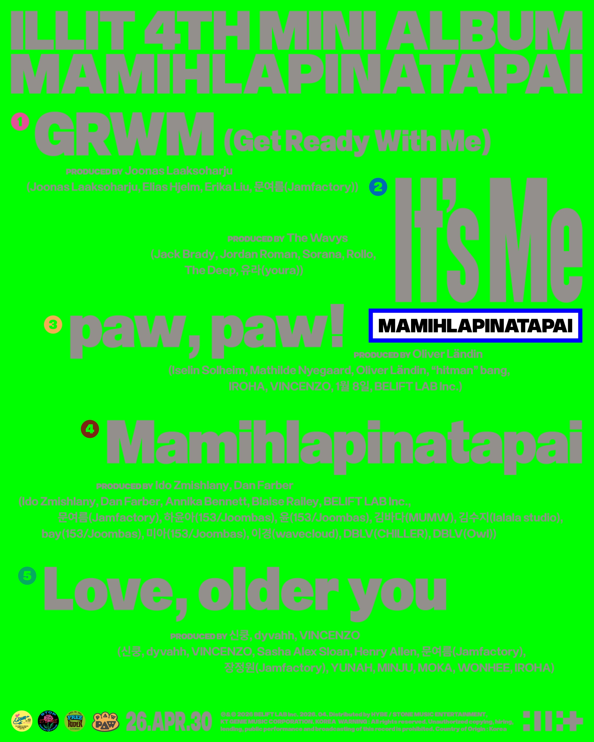 아일릿(빌리프랩(하이브)제공)(서울=뉴스1)고승아기자=그룹아일릿(ILLIT)이1020세대의공감을유발한다.아일릿(윤아,민주,모카,원희,이로하)은31일하이브레이블유튜브채널에미니4집'마밀라피나타파이'(MAMIHLAPINATAPAI)의트랙리스트를공개했다.이에따르면신보에는타이틀곡'잇츠미'(It'sMe)를포함해'GRWM(겟레디위드미,GetReadyWithMe)','포,포!'(paw,paw!),'마밀라피나타파이','러브,올더유'(Love,olderyou)등총5곡이실린다.'잇츠미'는첫데이트이후좋아하는상대와관계정의에대한고민이깊어지는찰나,'너의최애는바로나야!'라고당돌하게외치는노래다.이곡은개성강한싱어송라이터유라와더딥이작사에참여해아일릿의당찬매력을극대화했다.싱글1집타이틀곡'낫큐트애니모어'(NOTCUTEANYMORE)에서독특한가사로아일릿특유의엉뚱발랄함을감각적으로풀어내호평받은유라가멤버들과다시만나일으킬시너지에기대가모인다.트랙전반에동세대의관심사와정서가투영돼있다.너와함께민낯으로속마음을나누는내밀한순간을그린'GRWM',사랑하는반려동물을향한애틋함을담은'포,포!'가듣는이들의공감을자극할전망이다.'포,포!'는멤버이로하가데뷔뷔후처음으로작사에참여,자신의경험담을녹여진솔한노랫말을썼다.여기에하이브방시혁의장이힘을보탰다.또한수많은선택과책임앞에서'게으른완벽주의자'가되어버린동시대청년들에게아일릿이전하는곡'마밀라피나타파이',힘들고포기하고싶은순간들이있던어린시절의나에게보내는편지같은곡'러브,올더유'가앨범을채운다.특히'러브,올더유'는다섯멤버의실제이야기를담아아일릿만의독보적인감성을예고했다.아일릿의미니4집'마밀라피나타파이'는오는4월30일발매된다[email protected]©뉴스1.Allrightsreserved.무단전재및재배포,AI학습이용금지.