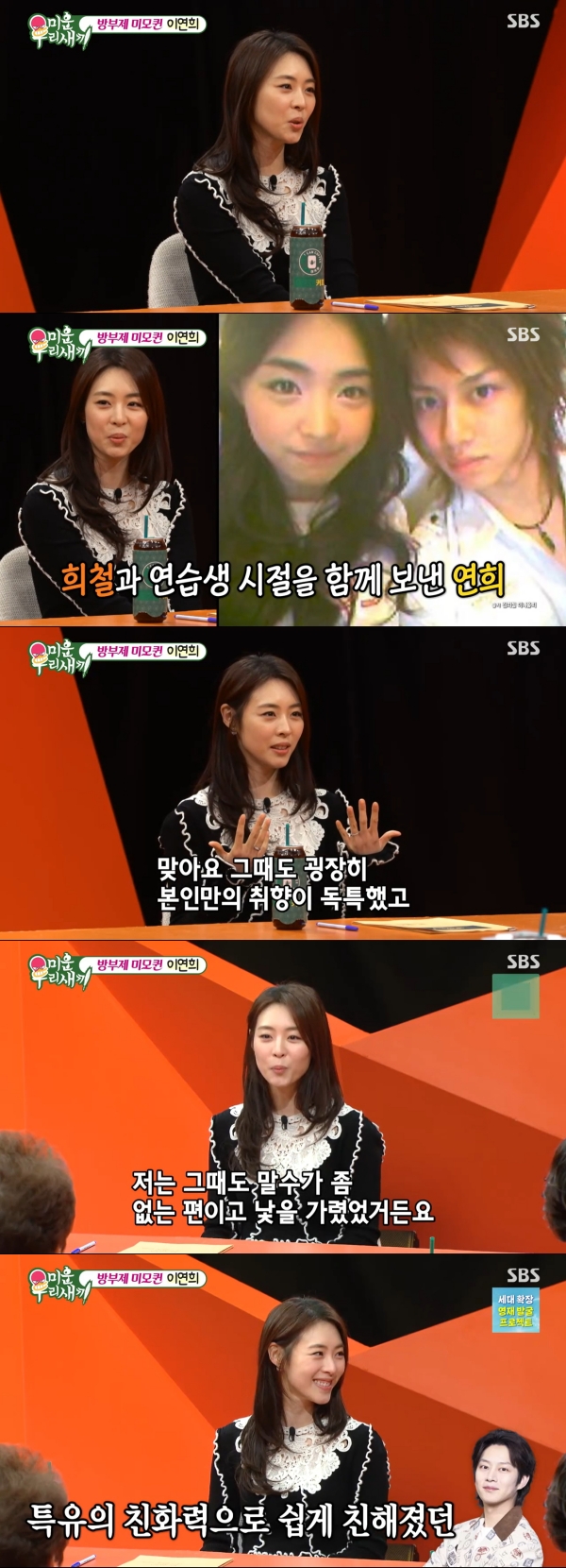 사진=SBS[스포츠투데이김태형기자]배우이연희가김희철의연습생시절을떠올렸다.29일방송된SBS'미운우리새끼'에는이연희가스페셜MC로출연했다.서장훈은"이연희씨가연습생시절과신인시절을함께보낸아드님이있다고한다"고말했다.이연희는"SM에서희철오빠랑같이연습생시절을보냈다"며고개를끄덕였다.이에신동엽은"그당시희철이는얘기듣기론굉장히파격적이었다"고떠올렸고,이연희는"그때도본인만의취향이독특했다"고밝혔다.그러면서"또주변에여자친구분들이많았다.말도잘하고여자들이랑도잘어울렸다.저는말수가없는편이고낯도가렸는데오빠가편하게잘리드해주고,데리고다니고밥도사줬다"고말했다.이때서장훈은"여성출연자가나오면우리어머니들이굉장히관심있게보신다.혹시모르실까봐미리말씀드리면이연희씨는결혼하셨다"고언급했다.그러자어머니들은"아이고아까워라"라고반응해웃음을안겼다.결혼7년차인이연희는슬하에19개월된딸을두고있다.그는"주변에남편친구분들이얘기해주시는데,남편은'내운을다썼다'고한다"며웃었다.또한남편이결혼하기전,친구들에게이연희와사귄다고밝혔더니아무도안믿었다는비화도전해져웃음을자아냈다.이연희는"근데실제로보시면서도믿지않으신것같다"고덧붙였다.[스포츠투데이김태형기자[email protected]]Copyright©스포츠투데이.무단전재및재배포금지.