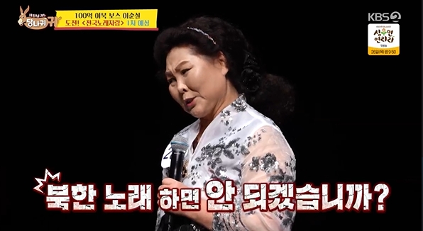 KBS2TV‘사장님귀는당나귀귀’캡처KBS2TV‘사장님귀는당나귀귀’캡처[뉴스엔서유나기자]탈북민출신방송인겸CEO이순실이'전국노래자랑'예심에서탈락했다.3월22일방송된KBS2TV예능'사장님귀는당나귀귀'(이하'사당귀')349회에서는이순실이'전국노래자랑'오디션에참가했다.이날이순실은'전국노래자랑'2차예심에진출했다.심사위원들앞에서'요즘여자요즘남자'를부른이순실은심사위원반응이좋지않은듯하자자발적으로개인기까지펼쳤다.하지만최종적으로이순실은2차예심에서탈락하며본선진출에실패했다.22팀이나뽑는데끝까지합격자로이름이불리지못한이순실에전현무는"떨어졌다.여기진짜냉정하다"라며경악했고이순실은침울한표정을감추지못했다.한편이순실은탈북후개성식떡,냉면등의사업을시작,탈북18년만에연매출100억을달성했다.뉴스엔서유나stranger77@기사제보및보도자료[email protected]ⓒ뉴스엔.무단전재&재배포금지Copyright©뉴스엔.무단전재및재배포금지.