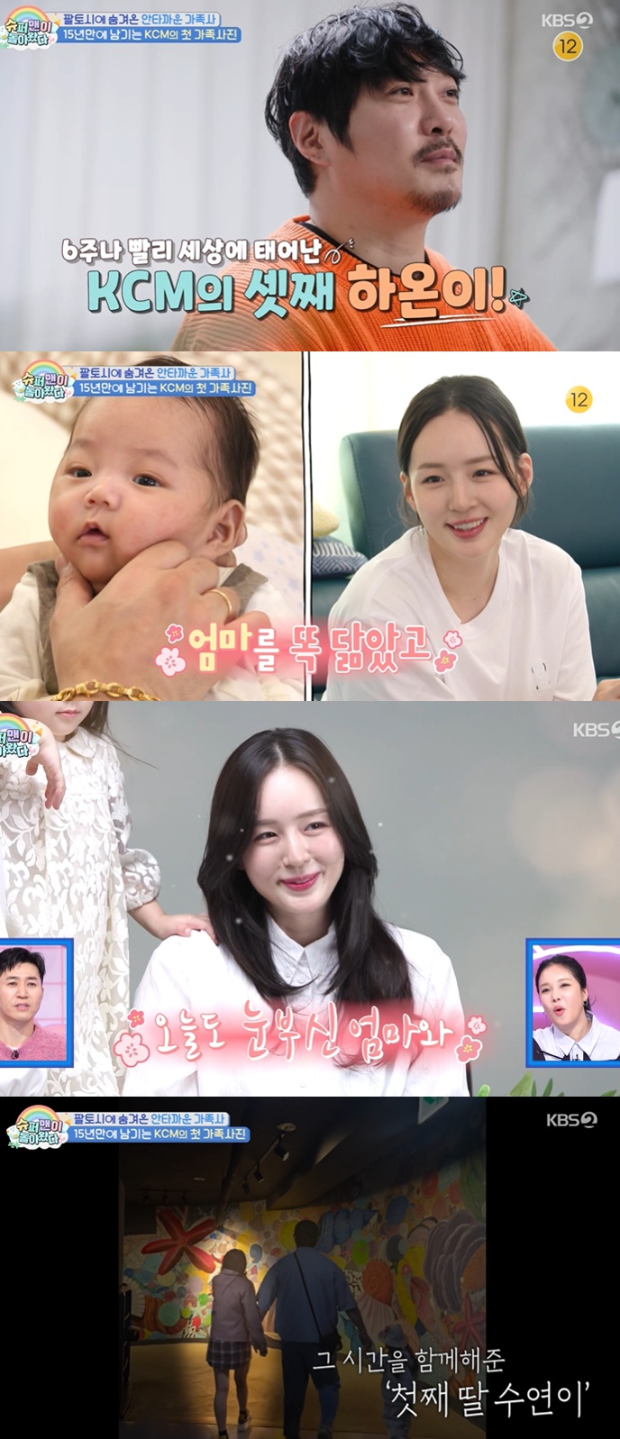 사진=KBS1‘슈퍼맨이돌아왔다’방송캡처KCM이가족을향한진심을전했다.15일방송된KBS1‘슈퍼맨이돌아왔다’(이하‘슈돌’)에서는가수KCM이15년만에처음으로가족사진을남기는여정이그려졌다.이날KCM은9세연하아내와두딸과함께사진촬영에나섰다.화면에등장한아내의단아한비주얼에김종민은“와진짜너무예쁘시다”고감탄을쏟아내눈길을끌었다.특히KCM은둘째딸하온의50일기념촬영을준비하며남다른감정을드러냈다.그는“하온이50일기념으로찍게됐다”며“특히첫째딸에게미안하고고마운마음이크다.남들다하는것부터추억을만들어가고싶다”고울먹이며진심을전했다.첫째딸수연양은2012년생으로현재중학교1학년에재학중인14세다.KCM부부는첫째출산이후오랜시간동거를이어오다2021년9월혼인신고를마쳤으며,코로나19여파로결혼식은가족과가까운지인들만참석한소규모언약식으로대신했다.이번방송에서는뒤늦게나마가족의시간을채워가려는KCM의모습이담기며뭉클함을더했다.김지혜기자[email protected]©일간스포츠.무단전재및재배포금지.
