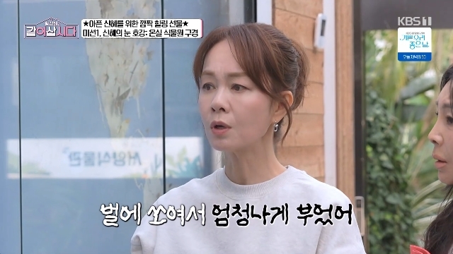 KBS1TV‘황신혜의같이삽시다’캡처KBS1TV‘황신혜의같이삽시다’캡처[뉴스엔서유나기자]미스코리아출신방송인장윤정이벌쏘임사고를당했다.4월15일방송된KBS1TV예능'황신혜의같이삽시다'15회에서는장윤정,정가은이다리를다친황신혜에게그녀만을위한하루를선물했다.이날장윤정,정가은은황신혜를즐겁게해주기위해온실식물원으로놀러갔다.이곳에서곤충전시관을발견한황신혜는"내가너무싫어하는게곤충이다.징그럽다"고토로했다.이어황신혜는장윤정에게"얼마전에너벌에쏘였다며"라고물었다.장윤정이"맞다.벌에쏘여서이만큼부었다"고인정하자황신혜는"옷속으로(벌이)들어가서팔을쐈단다.여기보니까빨갛더라"고전했고,장윤정은"내가발버둥치니까쏘고도망갔다"고덧붙였다.황신혜는이에"여기쏴서다행이지가슴쐈으면어쩔뻔했냐"고말했고웃음이빵터진정가은은"언니어떻게그런생각을하냐"고물었다.황신혜는"순간그런생각이들었다"고너스레떨었다.뉴스엔서유나stranger77@기사제보및보도자료[email protected]ⓒ뉴스엔.무단전재&재배포금지Copyright©뉴스엔.무단전재및재배포금지.