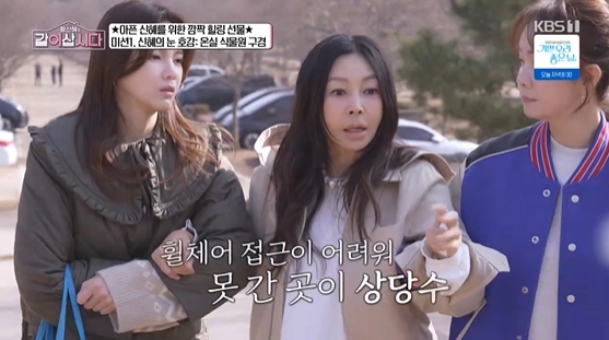 [OSEN=하수정기자]배우황신혜가발가락골절상을입었다.15일오후방송된KBS1예능'황신혜의같이삽시다'에서는발에골절상을입어울적한황신혜를위해장윤정-정가은이특별한'힐링데이'가펼쳐졌다.황신혜는두동생의부축을받으면서등장했고,"언니괜찮냐?어쩌다가다쳤냐?"고물었다.이에황신혜는"정말어이없게모든일이순간인것같다"고했다.제작진과인터뷰에서황신혜는"통굽슬리퍼를신고있었는데차에서내릴때슬리퍼가발에서툭빠졌다.내리면서'발에슬리퍼를껴야지'하는순간높낮이가안맞이사삐걱했다.바로정형외과에달려갔는데,엄지발가락금이갔다고하더라.정말절망적이었다"며발가락골절을언급했다.또한황신혜는"다치니까계단걷는게너무힘들다.장애인들이휠체어를타고다닐수있는곳이진짜없다"며"(전신마비)내동생이휠체어를타니까우리가족들이식당을가거나하면갔다가계단때문에못간적이있다"고털어놓기도했다.이날두동생들은골절상을입은황신혜를위해서휠체어를준비해식물원구경을시작했다./[email protected][사진]'황신혜의같이삽시다'화면캡처Copyright©OSEN.무단전재및재배포금지.