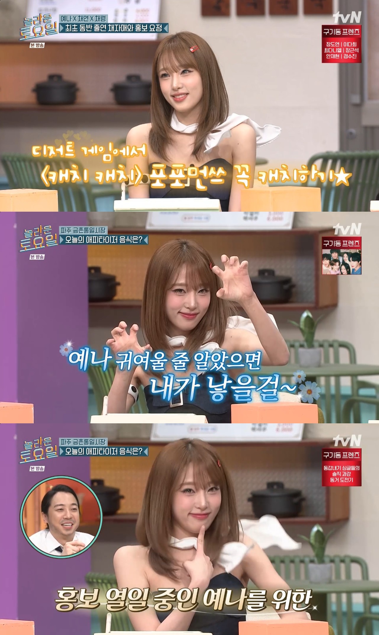 가수최예나(YENA)가신곡홍보와웃음등두마리토끼를잡았다.iMBC연예뉴스사진21일방송된tvN'놀라운토요일'(이하'놀토')에출연한최예나는댄스동아리'춤신춤왕'삼인방으로등장했다.이날특유의통통튀는개성과트렌디함이묻어나는데님스타일링으로시선을사로잡은가운데최예나는"녹음할때마다'놀토'촉이좋은편이다.'네모네모','너만아니면돼'녹음할때도받아쓰기에나오겠다싶었는데그대로나와서이후부터는곡작업할때마다'놀토'를생각하면서하게된다"고말해기대감을높였다.새앨범발매소식으로축하를받은최예나는붐의'홍보유료화'견제로퍼포먼스를선보이지못하게되자'캐치캐치'라이브로승부수를던졌다.최예나는음식소개후잡힌원샷에서포즈를취하다가도라이브와포인트안무를선보이면서틈새홍보를노렸고,간식게임에서1등으로정답을캐치한뒤하이힐까지벗고퍼포먼스를펼쳤다.에피타이저게임으로몸을푼최예나는경력직출연자인만큼도레미멤버들사이에완벽히녹아들어받아쓰기게임을이어갔다.1라운드간미연의'미쳐가'문제에서는첫번째정답자로나섰지만오답이나오자강냉이를'캐치'해내며웃음을선사했고,간식게임에서는오빠최성민이나오자흠칫놀라는가하면아이즈원의'파노라마'가나오자퍼포먼스를펼치며존재감을드러냈다.홍보도성공하고예능감도자랑한최예나는"게임도재밌게하고맛있는것도많이먹었는데홍보도야무지게한것같다.'캐치캐치'많이들어주시길바란다"고소감을전했다.한편최예나는각종음악방송에출연하며'LOVECATCHER'활동을이어가고있다.iMBC연예백아영|사진출처tvNCopyright©MBC연예.무단전재및재배포,AI학습금지.