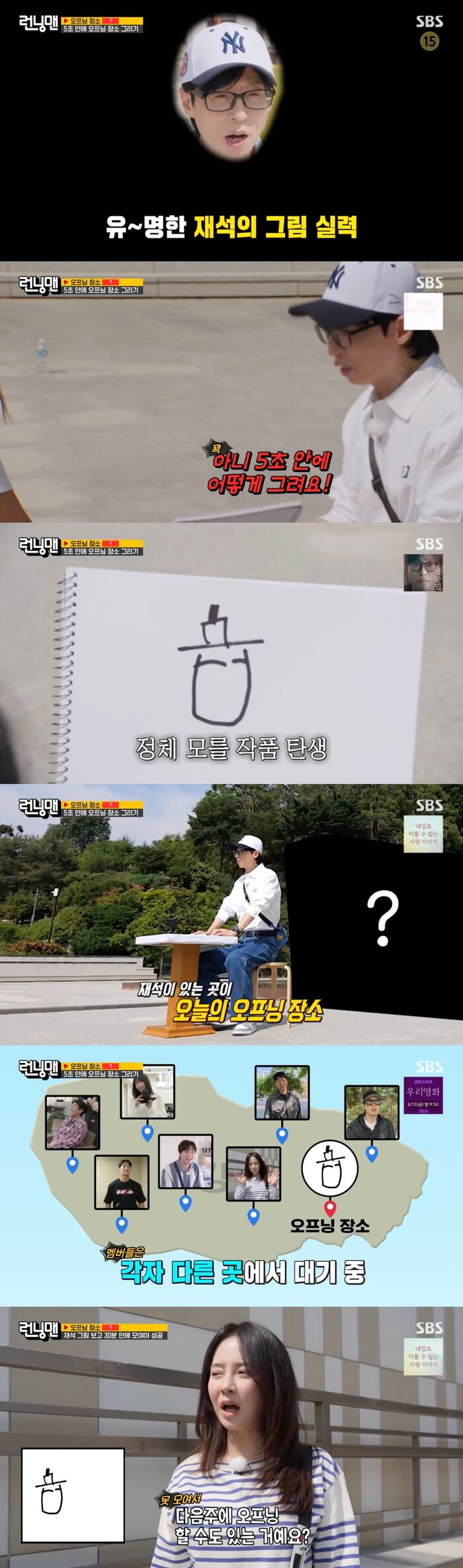 [SBS연예뉴스|김효정에디터]유재석이똥손임을다시한번입증했다.8일방송된SBS'런닝맨'에서는'그리는대로트립'레이스가진행됐다.이날방송에서유재석은혼자오프닝장소에도착했다.이에제작진은5초안에이곳이그림을그리라고했다.똥손으로유명한유재석은크게당황하며그림을그렸고,정체모를작품이탄생했다.이를본제작진은"지금멤버들이각자다른곳에서대기중이다.이그림만보고30분안에이곳으로모여야성공이고레이스에유리한혜택도획득할수있다"라며미션을알렸다.유재석의그림을받아든멤버들은"오늘녹화인데다음주에오프닝할수도있는거냐"라며당황했다.그리고유재석은멤버들중자신의그림세계가비슷한양세찬이가장먼저알아보지않을까하고기대를해어떤결과가나올지궁금증을자아냈다.Copyright©CopyrightⓒSBS.Allrightsreserved.무단전재,재배포및AI학습이용금지