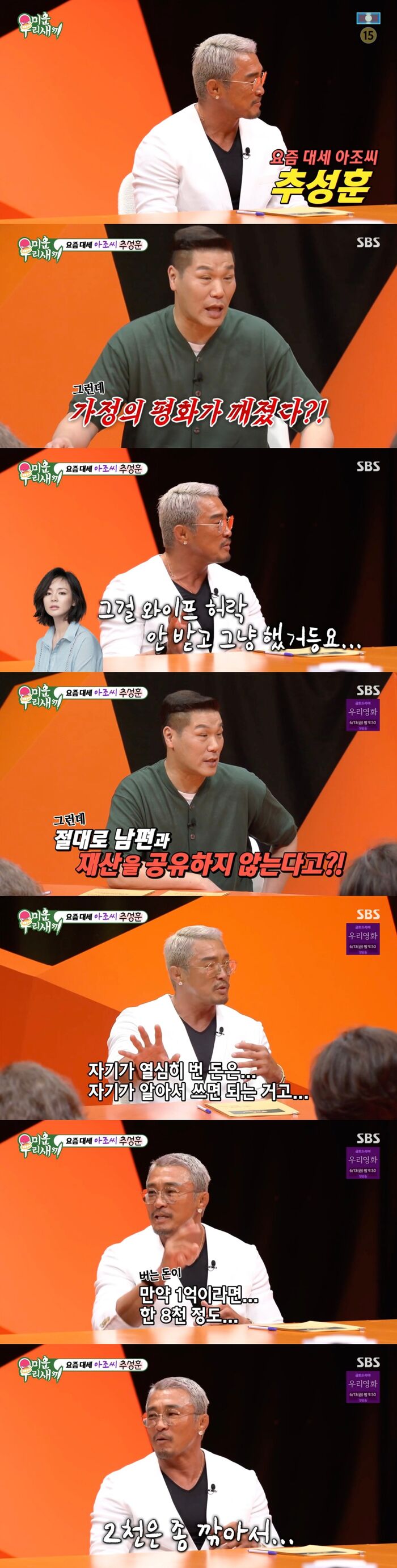 [SBS연예뉴스|김효정에디터]추성훈이아내야노시호와재산을공유하지않는다고밝혔다.8일방송된SBS'미운우리새끼'(이하'미우새')에서는대세아조씨추성훈이스페셜MC로등장했다.이날방송에는요새가장핫한아저씨추성훈이등장했다.자신의유튜브채널에집을공개하며가정의평화를깨뜨렸다는추성훈.그는"이거때문에엄청싸웠다.당시유튜브채널이커지고있던상태였는데다없애라고하더라"라며"근데왜집공개를허락받아야하냐.맨날청소하면되지"라고억울함을토로해웃음을자아냈다.서장훈은추성훈의아내야노시호를언급하며"시호씨의재산이엄청난데공유하지않는다고하더라.아쉽지는않나?"라고물었다.그러자추성훈은"자기가벌었던돈인데그거알아봤자의미가없다.그거돈달라는것도이상하고.자기가열심히번돈알아서쓰면되는거다"라고쿨한모습을보였다.이에서장훈은추성훈본인도아내에게수입을다공개하지않는지물었다.그러자추성훈은"당연히그렇다.만약1억이면8천정도2천깎고이야기한다"라고너스레를떨었다.Copyright©CopyrightⓒSBS.Allrightsreserved.무단전재,재배포및AI학습이용금지