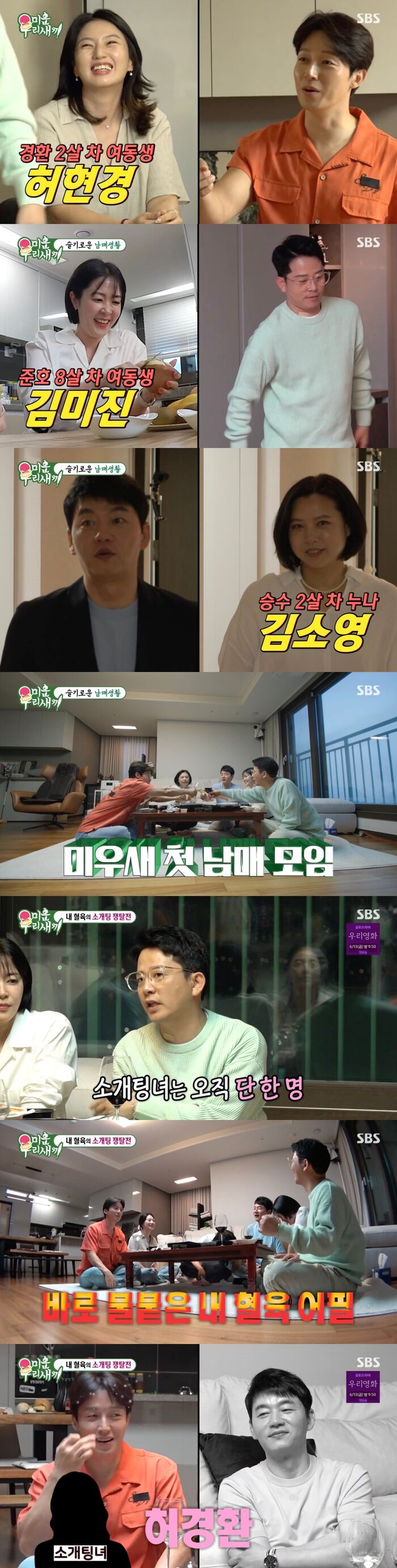 [SBS연예뉴스|김효정에디터]김승수와허경환중소개팅을받을주인공을?8일방송된SBS'미운우리새끼'(이하'미우새')에서는김승수,김준호,허경환이여자형제들과등장해눈길을끌었다.이날방송에는김준호의동생김미진,김승수의누나김소영,허경환의동생허현경이한자리에모여미우새첫남매모임을가졌다.기혼인여자형제들과달리솔로인김승수와허경환.이에김준호는"미진이가소개팅해줄사람을구해온거같다.그런데딱한명이다"라며허경환과김승수중한명에게만소개팅을해줄수있다고했다.이어김준호와김미진은"금융권에종사하고키도크고운동하는것도좋아한다"라며소개팅상대를어필했다.이에김승수의누나김소영과허경환의동생허현경은자신의남자형제를어필해웃음을자아냈다.이때김준호와김미진은즉석에서소개팅상대와통화를연결했다.이에김준호는평소호감이던미우새가있는지물었다.그러자소개팅상대는"김종국"이라고말해소개팅후보들을실망하게만들었다.그럼에도두사람은열심히본인을어필했다.나이와재력으로어필하는두사람중소개팅상대는허경환을선택했다.이에김승수는"어디가그렇게싫으냐?그렇게최악이냐"라며우울한얼굴을했다.이어그는"제가양도하는집이어디에있고어느규모인지모르시잖아요"라며끝까지질척거리는모습을보여폭소를자아냈다.Copyright©CopyrightⓒSBS.Allrightsreserved.무단전재,재배포및AI학습이용금지