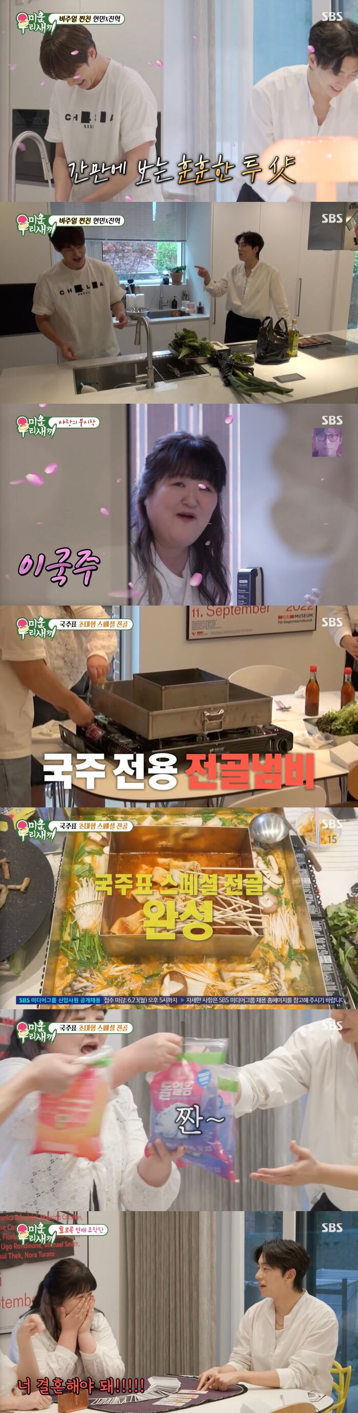 [SBS연예뉴스|김효정에디터]이국주가윤현민에게플러팅을했다.8일방송된SBS'미운우리새끼'(이하'미우새')에서는최진혁이윤현민에게한여성의만남을주선했다.이날최진혁은동갑내기찐친윤현민과투닥거리며등장했다.그는윤현민을향해"이런집에서왜혼자사냐?결혼도안한다며?한번쯤은갔다와야하지않냐?"라고물었다.이에윤현민은"내가알아서할게.지금상태도나쁘지않다이거지"라며선을그었다.이어두사람은서로를디스하며동갑케미를뽐냈다.그리고최진혁은윤현민을만나기위해누군가가일본에서귀국했다고말해궁금증을자아냈다.곧윤현민을만나고싶었던주인공이공개됐다.바로개그우먼이국주.최진혁과절친한사이였던이국주는윤현민과의만남을주선해달라고했던것.그리고이날이국주는윤현민을위해초대형스페셜전골을준비해눈길을끌었다.또한윤현민의반려견에게"엄마라고불러"라며플러팅을해웃음을자아냈다.이후에도이국주는여러방법으로윤현민에게플러팅을했다.그리고가장자신있는요리로윤현민의마음을사로잡기위해도전했다.2구짜리버너두개를연결하고그위에직접준비한초대형냄비를올려초대형전골을만들었다.이를보던윤현민의어머니는"현민이가과묵하고우울해보여서늘개그맨친구들과사귀면얼마나좋을까생각했다.밝고명랑하고재밌고좋지않냐"라며이국주에대한호감을드러냈다.이에최진혁어머니도이국주에대한호감을밝혔다.그는"사람을잘챙기고너그러울거같아서좋아한다"라고솔직하게말했다.이날이국주는모두를놀라게할술레시피로눈길을끌었다.돌얼음이담긴지퍼팩에소주와탄산수,비타민음료까지섞은링겔주를만들어낸것.특히특대사이즈의술을1인당하나씩준비해모두를놀라게했다.이를본서장훈은"어떤것보다도차갑게마실수있어서좋은것같다"라고감탄했고모벤져스도"이거인기많아지겠다.한번만들어서마셔보고싶다"라며군침을흘렸다.그리고이날이국주는윤현민의연애타로점을봐주었다.비혼이라밝힌윤현민이뽑는카드를긴장한얼굴로보던이국주.이에이국주는"가능성이닫힐까봐긴장된다"라며너스레를떨었다.윤현민은신중하게카드를골랐다.그리고이에이국주는"비혼으로계속가면상처를받거나힘들거나할수있다.얘는결혼해야한다"라며비혼이어울리지않는다고풀이했다.이에윤현민과최진혁은진짜냐며깜짝놀랐다.하지만이를보던서장훈은"그냥자기맘대로해석하는거아니냐"라며이국주의의도를의심해폭소를자아냈다.Copyright©CopyrightⓒSBS.Allrightsreserved.무단전재,재배포및AI학습이용금지
